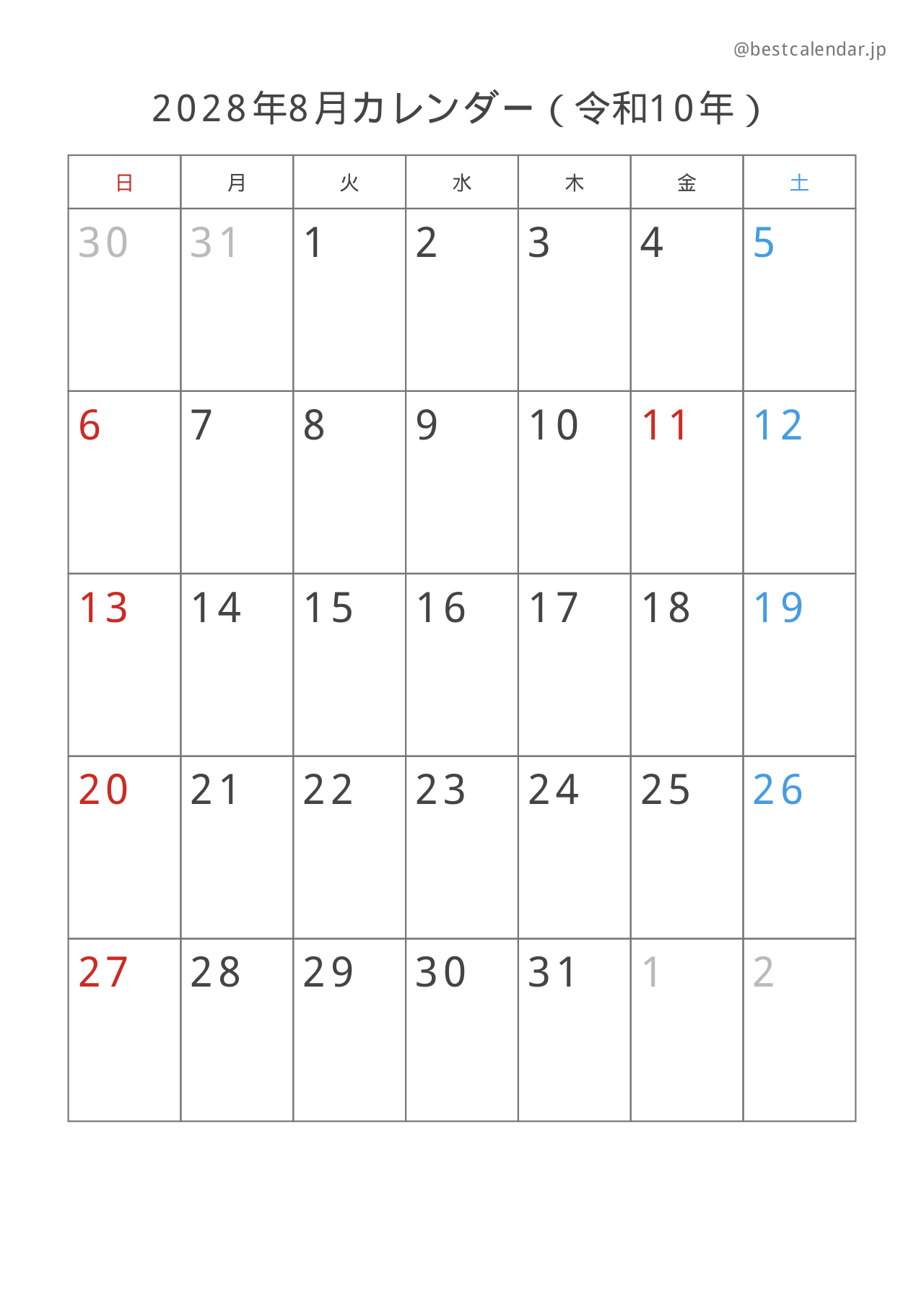 PDFファイルは高画質印刷に最適化されており、きれいに印刷できます。PNG画像形式は、スマートフォンやタブレット、パソコンでの表示に適しています。2028年8月のスケジュール管理にぜひご活用ください。