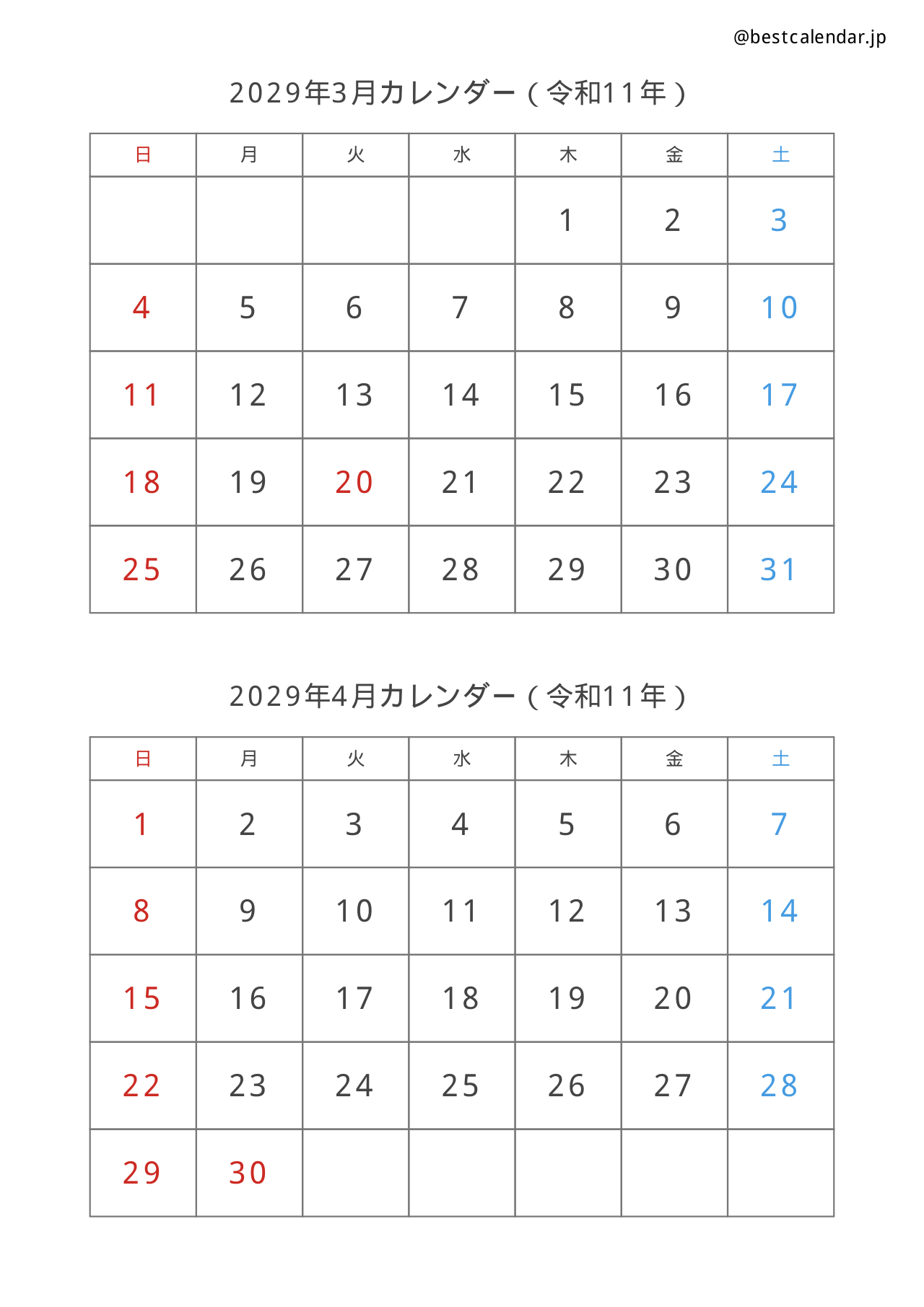 2029年3-4月の2ヶ月分を1枚にまとめたA4縦向きカレンダーです。