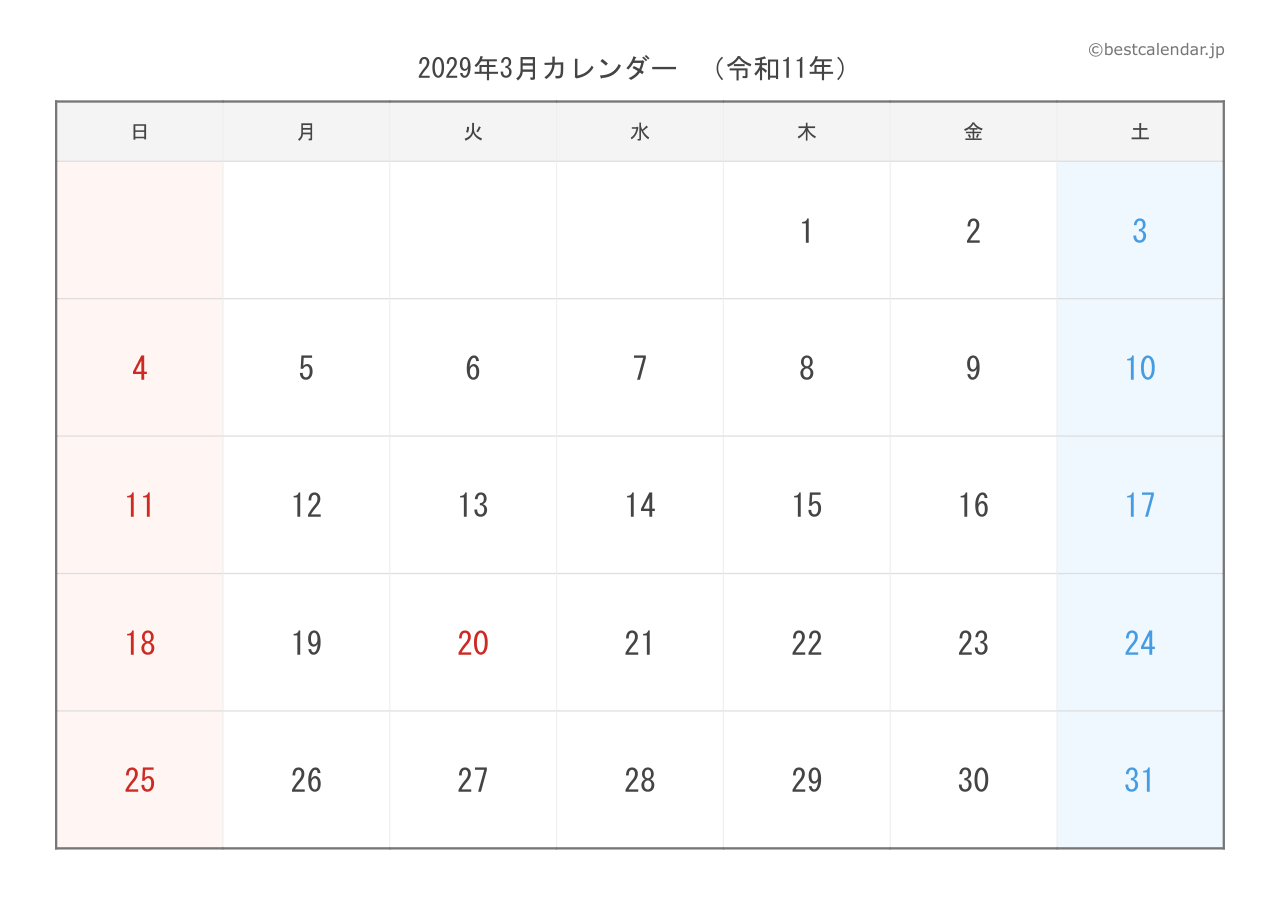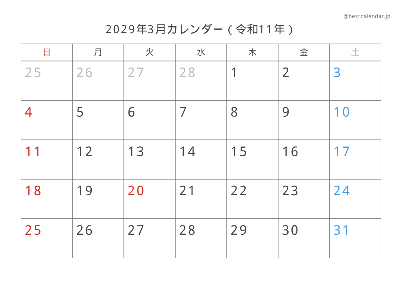 2029年3月のカレンダーです。A4サイズ横向きで印刷に最適化されています。