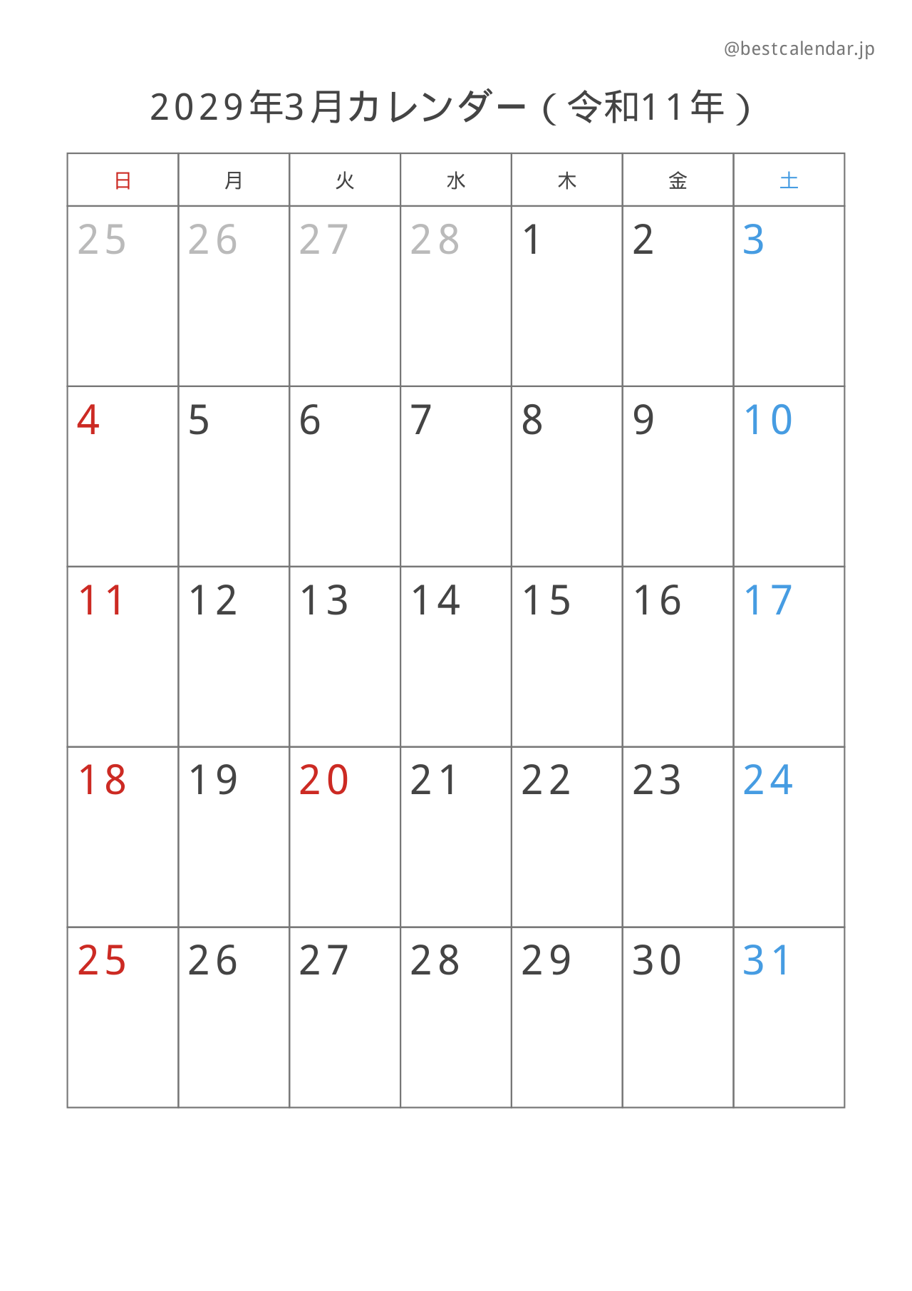 2029年3月のカレンダー(A4縦向き)です。記入重視のレイアウトで設計されています。