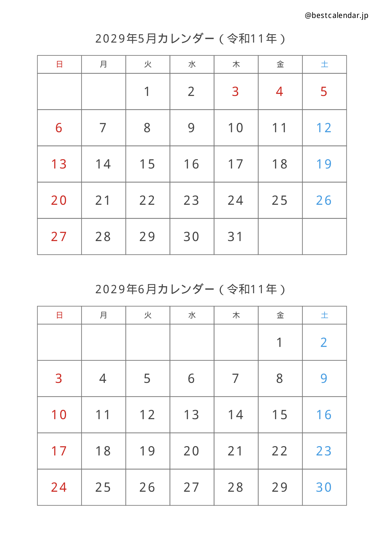 2029年5-6月の2ヶ月分を1枚にまとめたA4縦向きカレンダーです。