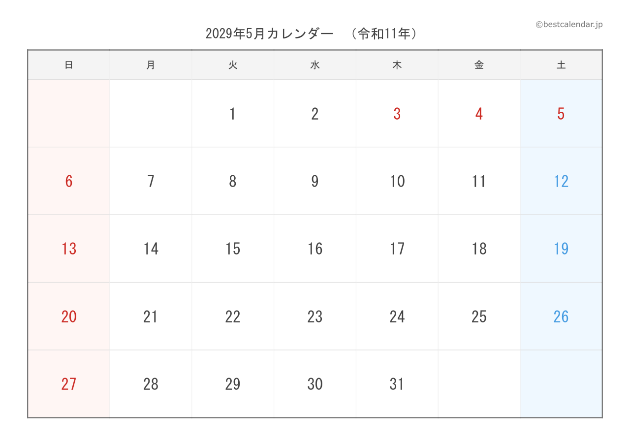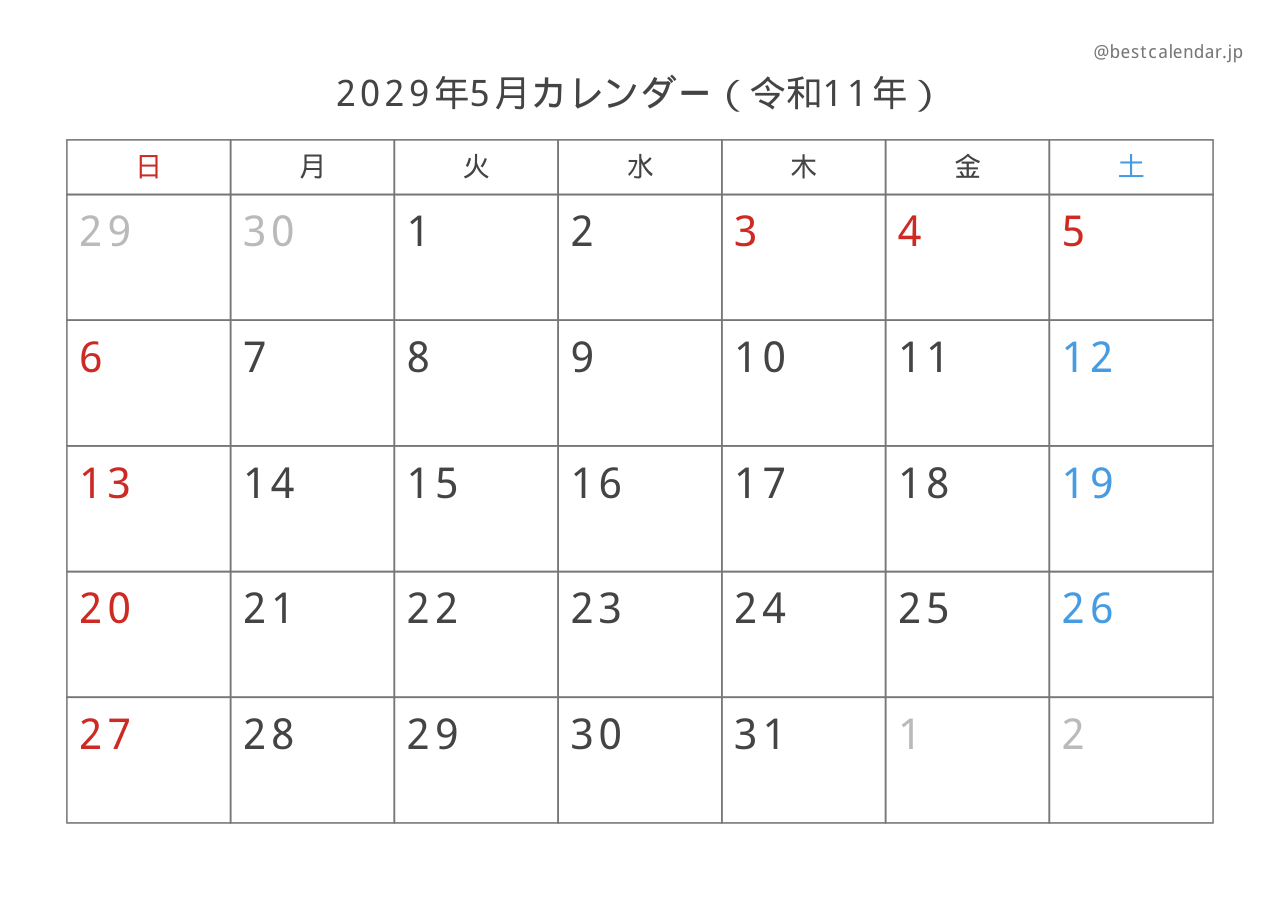 2029年5月のカレンダーです。A4サイズ横向きで印刷に最適化されています。