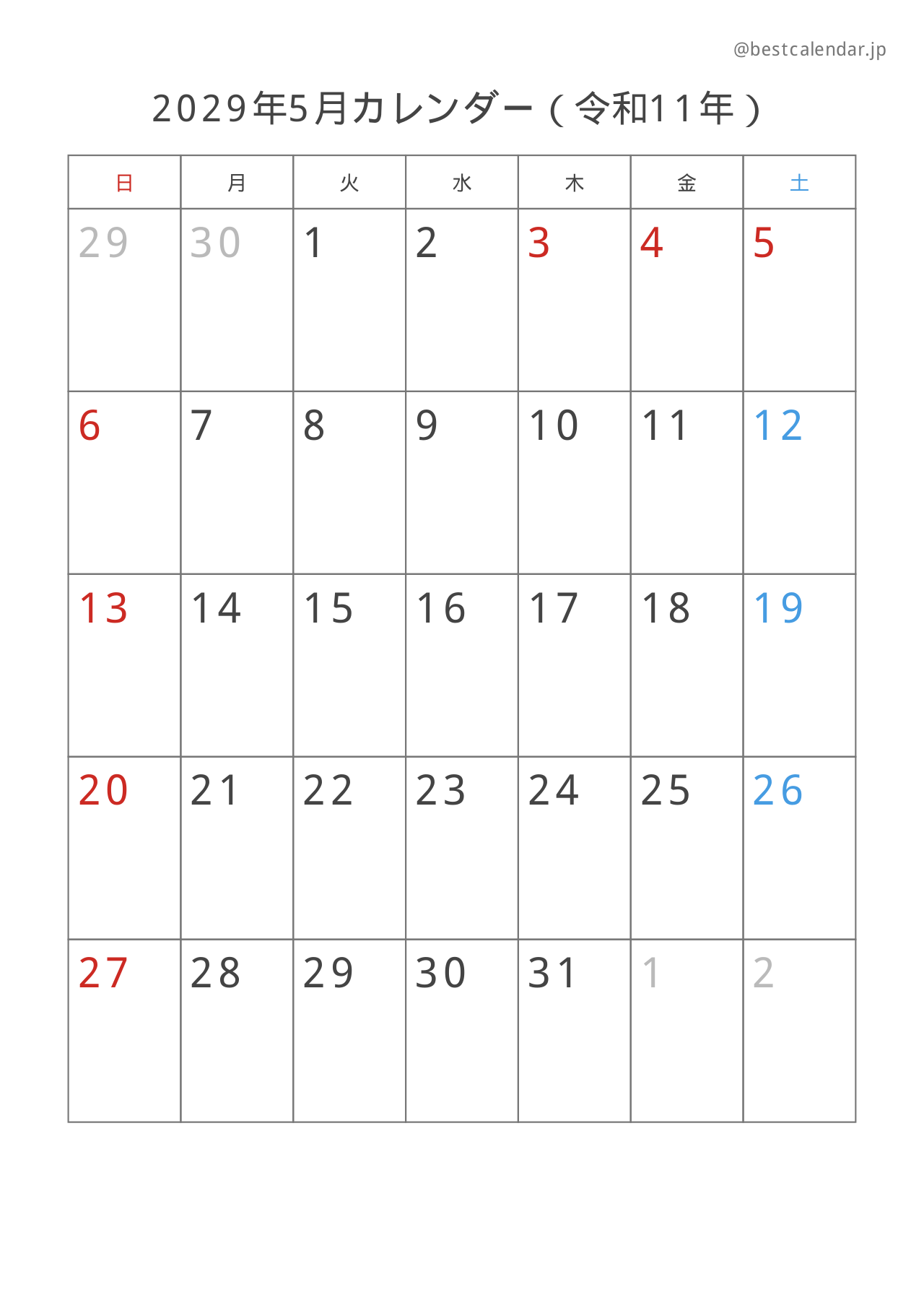 2029年5月のカレンダー(A4縦向き)です。記入重視のレイアウトで設計されています。