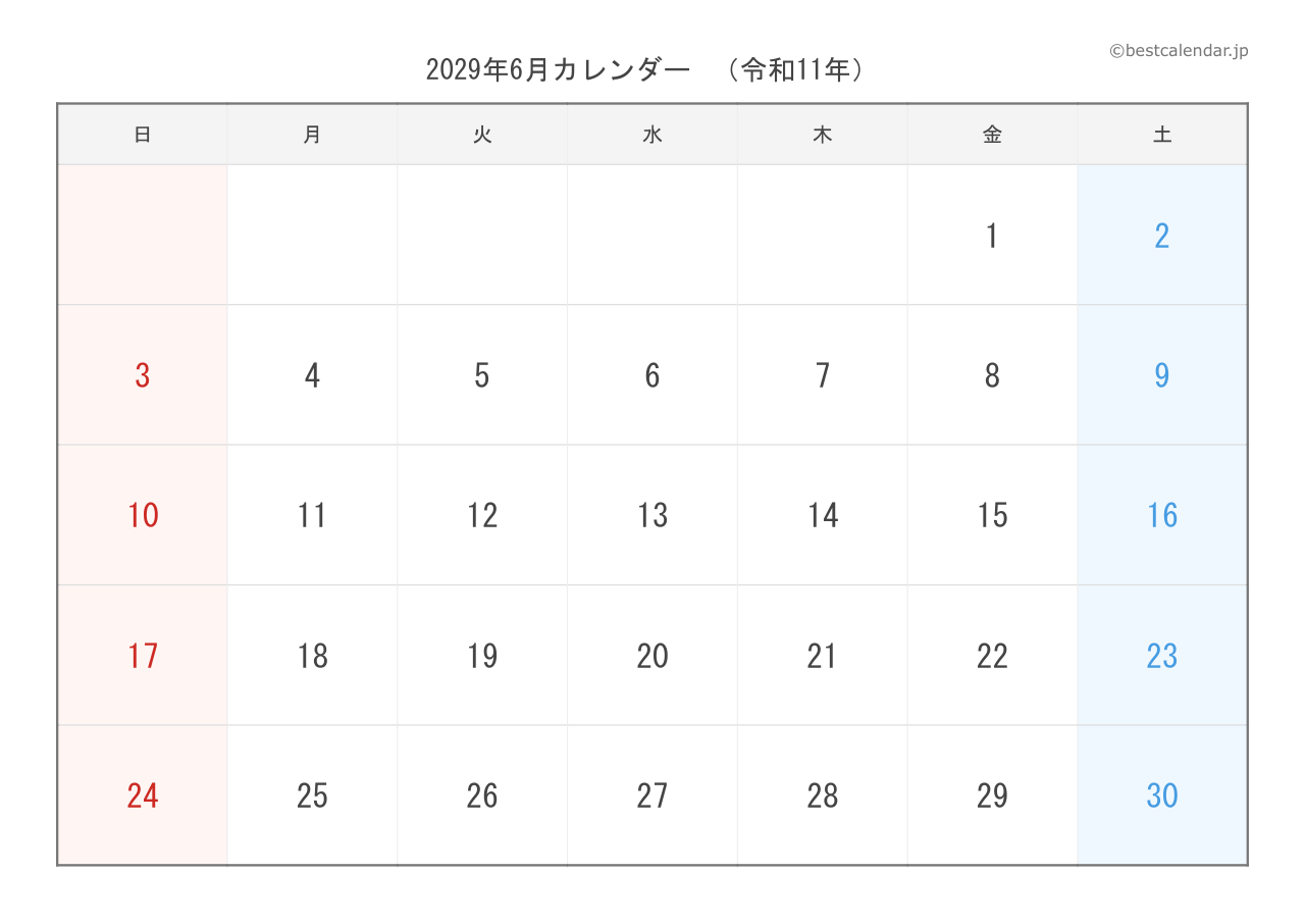 PDFファイルは高画質印刷に最適化されており、きれいに印刷できます。PNG画像形式は、スマートフォンやタブレット、パソコンでの表示に適しています。2029年6月のスケジュール管理にぜひご活用ください。