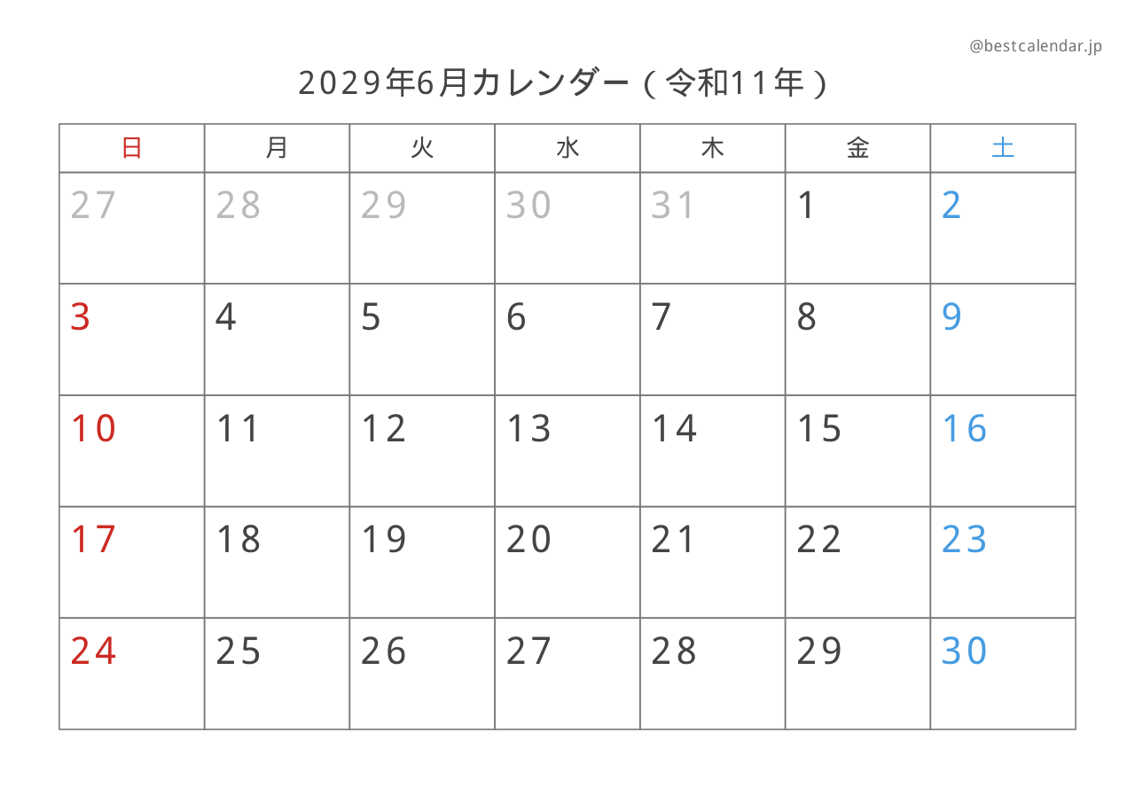 2029年6月のカレンダーです。A4サイズ横向きで印刷に最適化されています。
