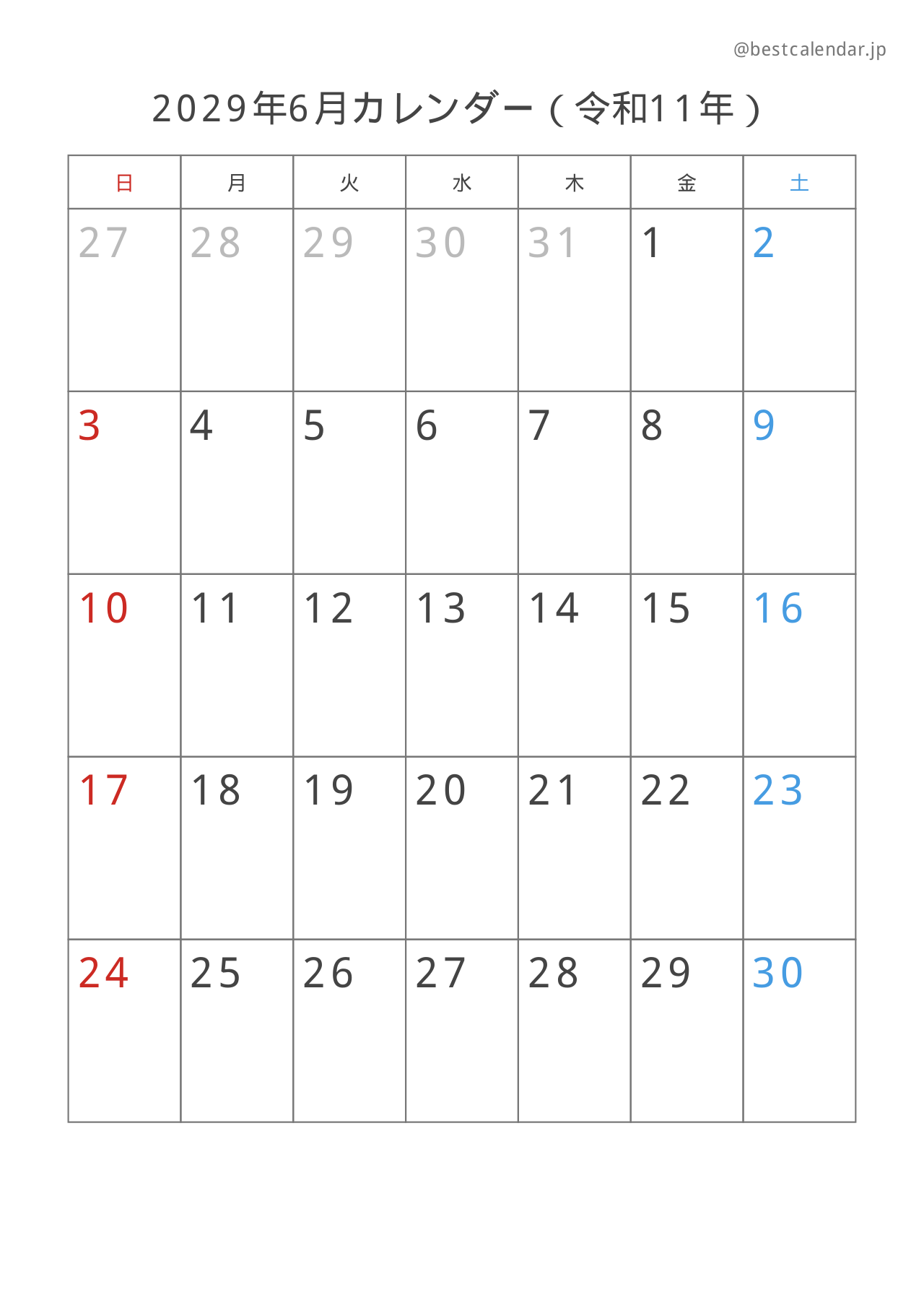 2029年6月のカレンダー(A4縦向き)です。記入重視のレイアウトで設計されています。