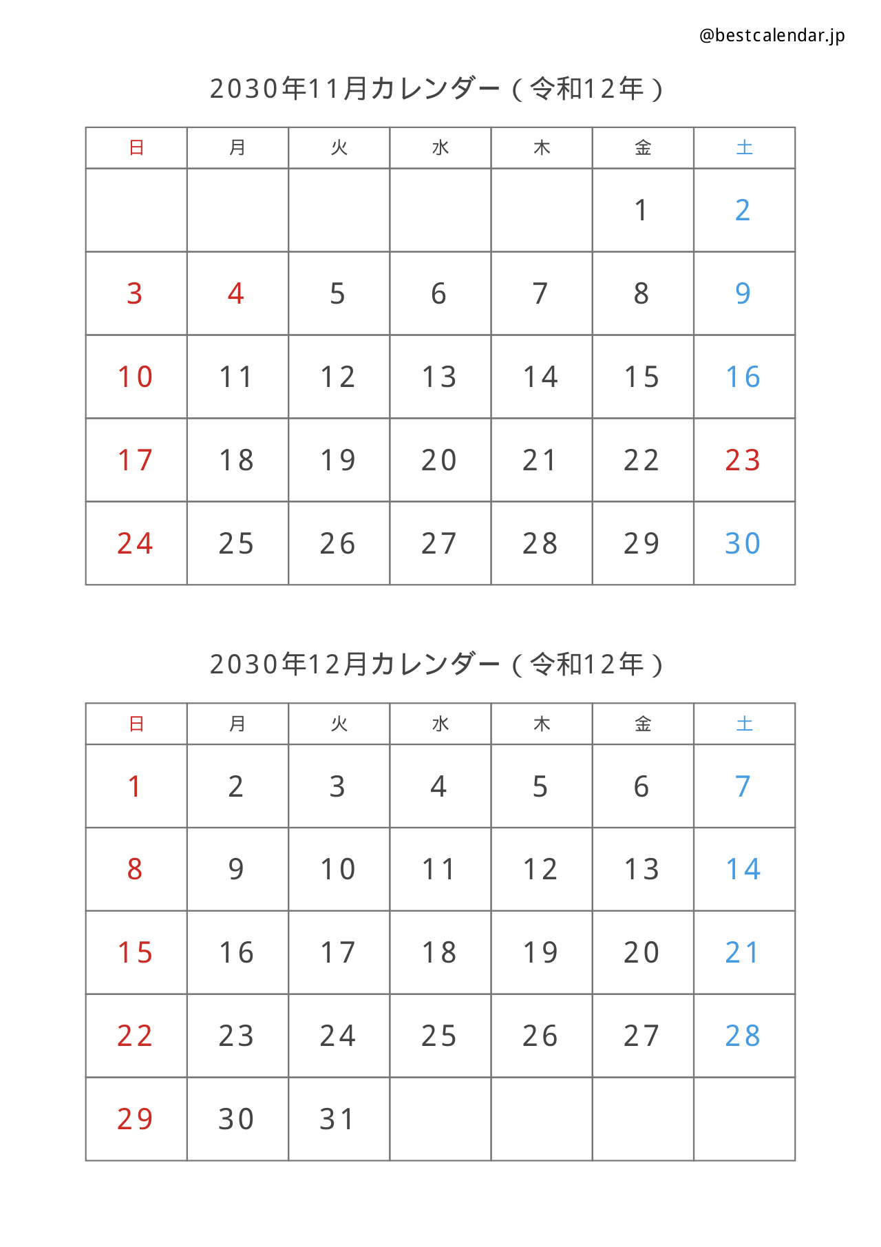 2030年11-12月の2ヶ月分を1枚にまとめたA4縦向きカレンダーです。