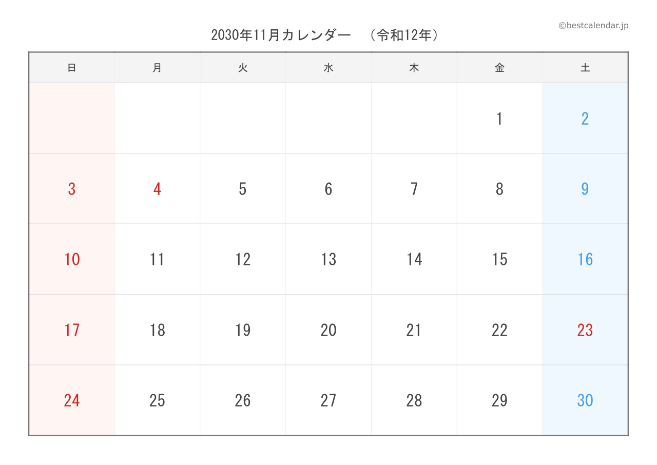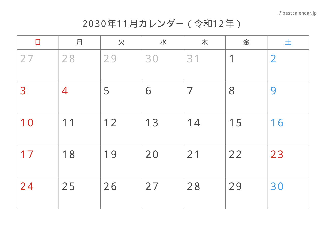 2030年11月のカレンダーです。A4サイズ横向きで印刷に最適化されています。