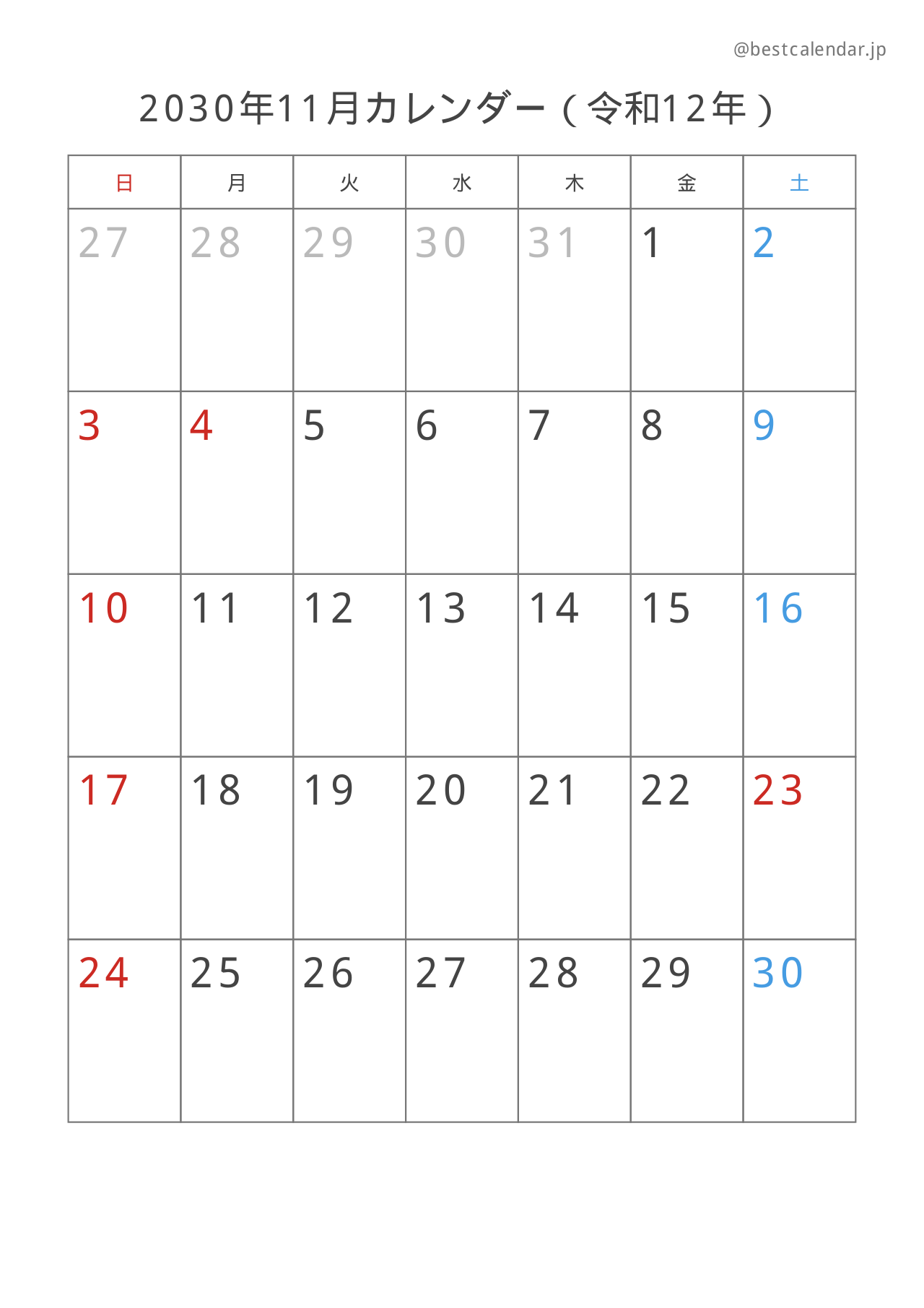 2030年11月のカレンダー(A4縦向き)です。記入重視のレイアウトで設計されています。