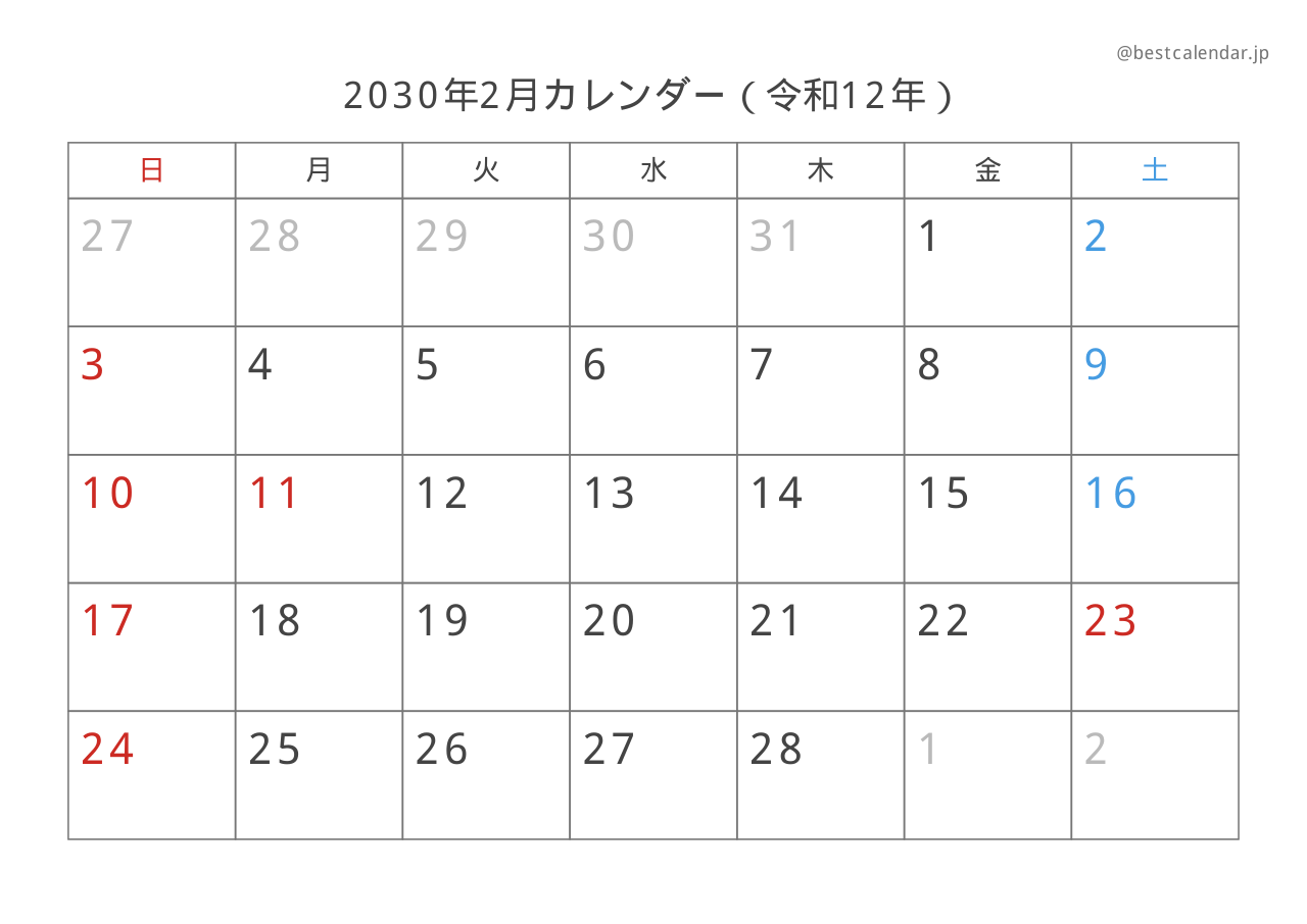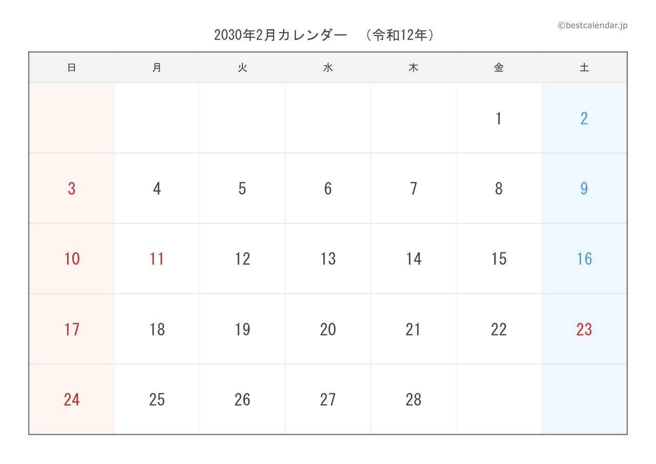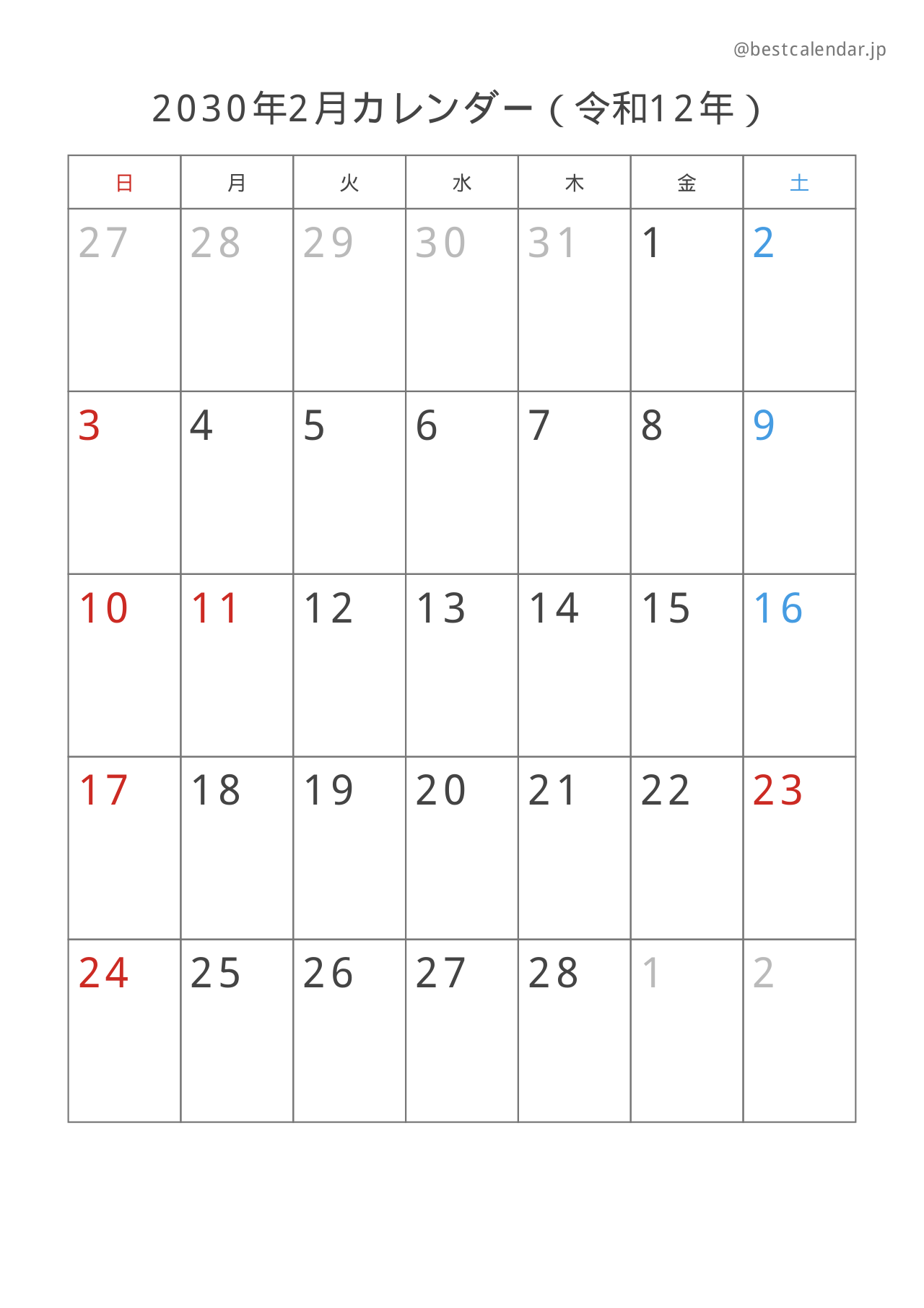 2030年2月のカレンダー(A4縦向き)です。記入重視のレイアウトで設計されています。