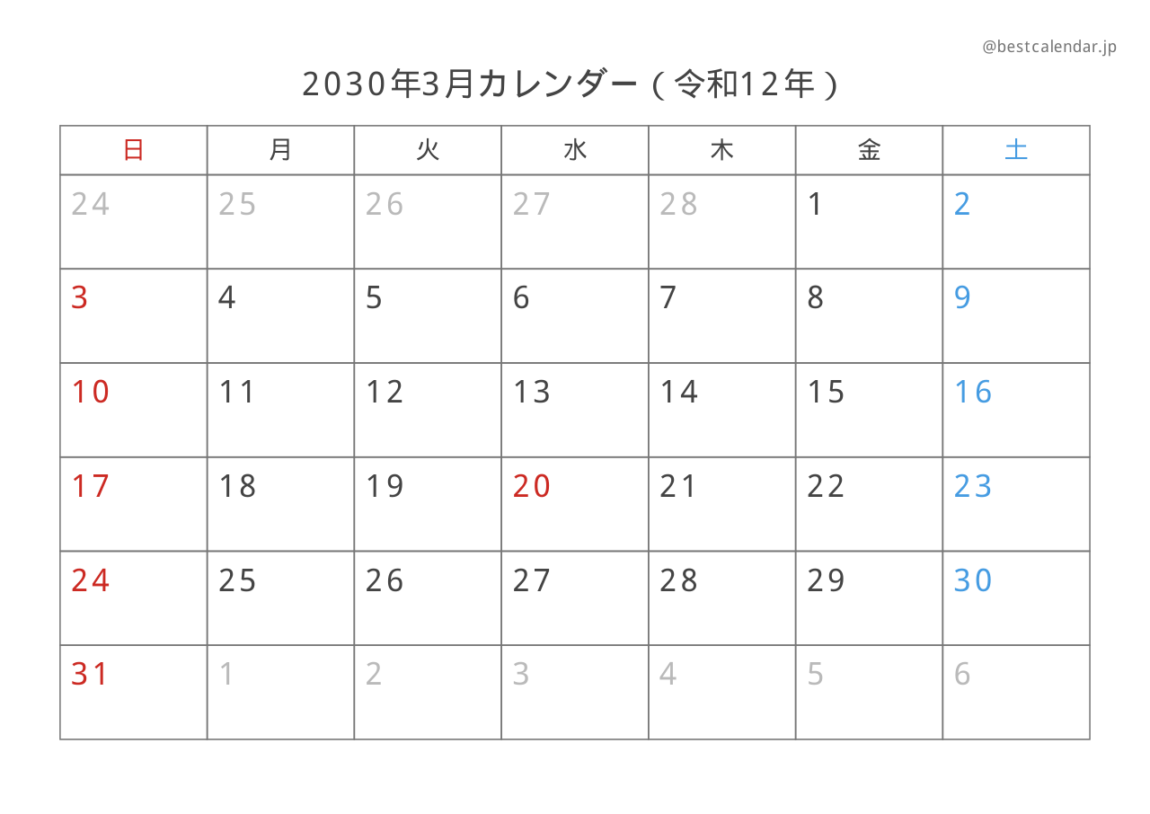 2030年3月のカレンダーです。A4サイズ横向きで印刷に最適化されています。
