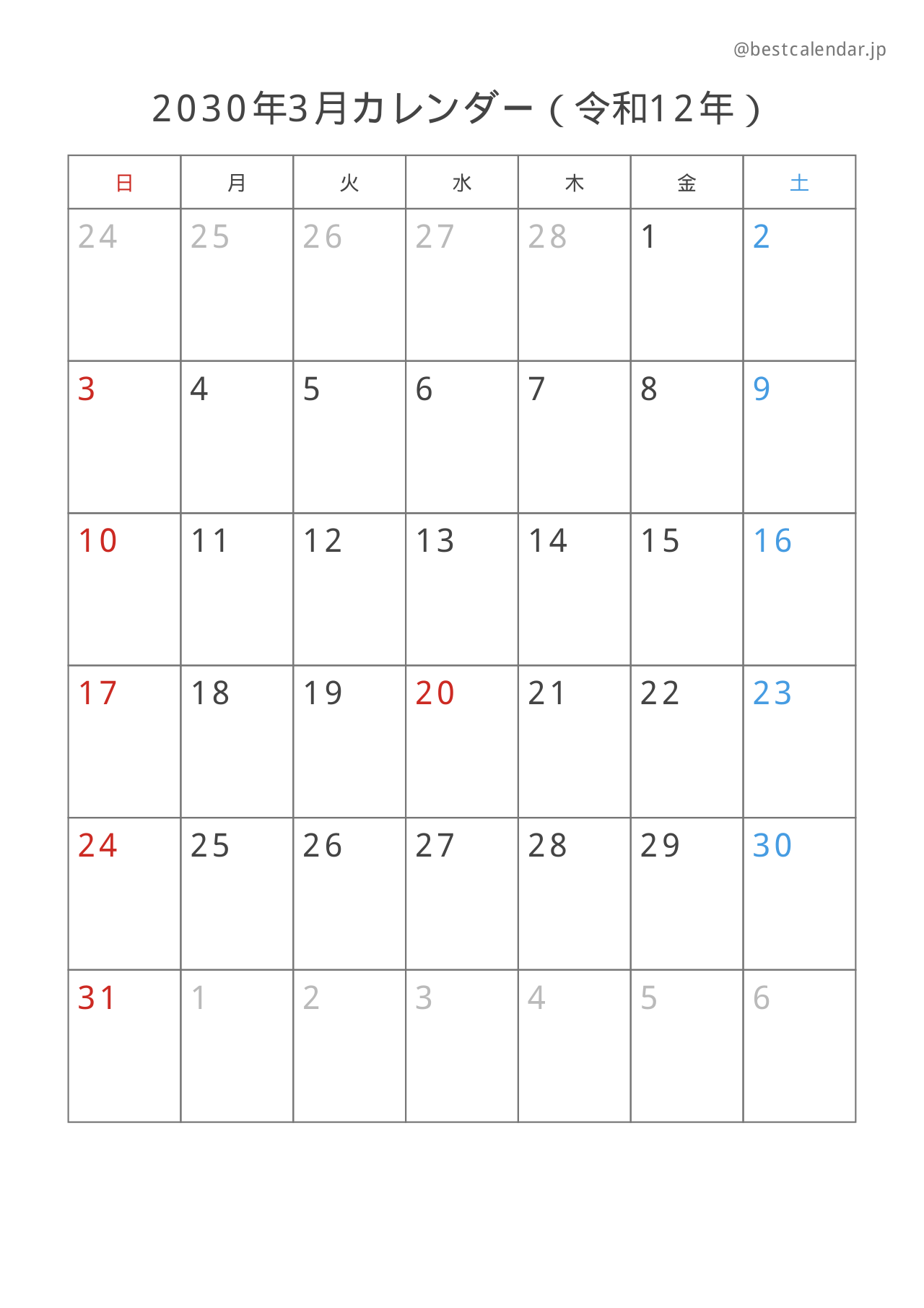 2030年3月のカレンダー(A4縦向き)です。記入重視のレイアウトで設計されています。