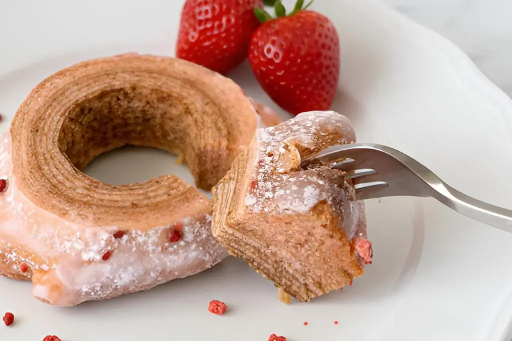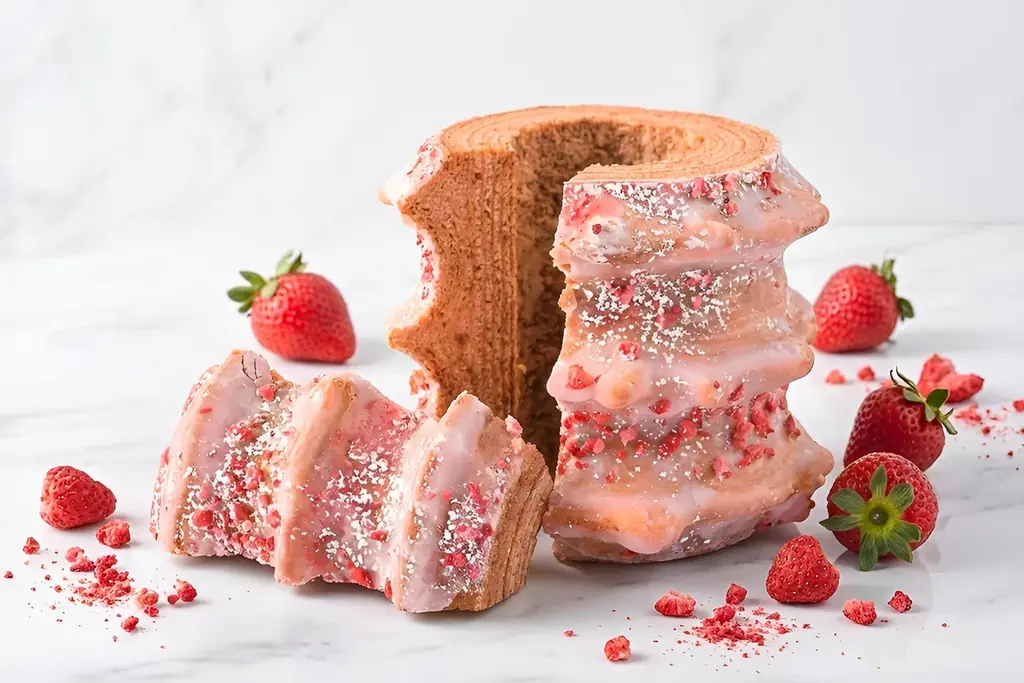 本商品は千葉県産米粉を100%使用した重厚なバウムクーヘン生地に、福岡県産のブランド苺「あまおう」を生地とシュガーグラスの両方に贅沢に練り込んだ、グルテンフリーながら満足感を追求したスイーツです。販売期間は2026年1月22日から4月頃まで(なくなり次第終了)と案内されています。