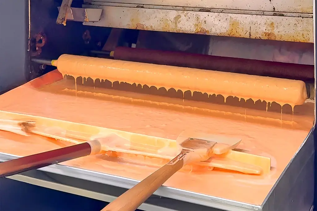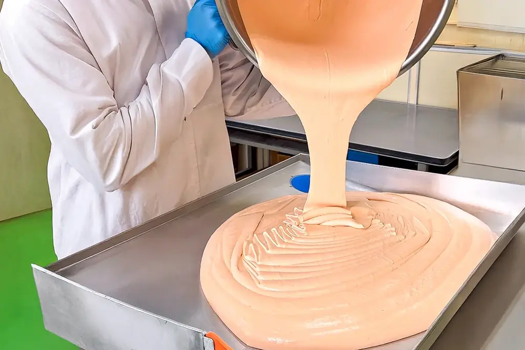 焼成工程では職人が温度と時間を細かく管理し、焼き色が茶色くなり過ぎないよう調整。封を開けた瞬間に広がる苺の香りと、見た目のピンクを残すことに成功しています。