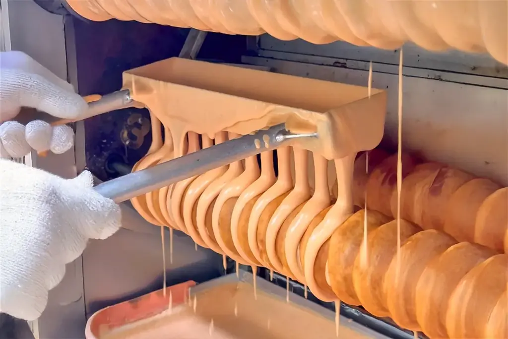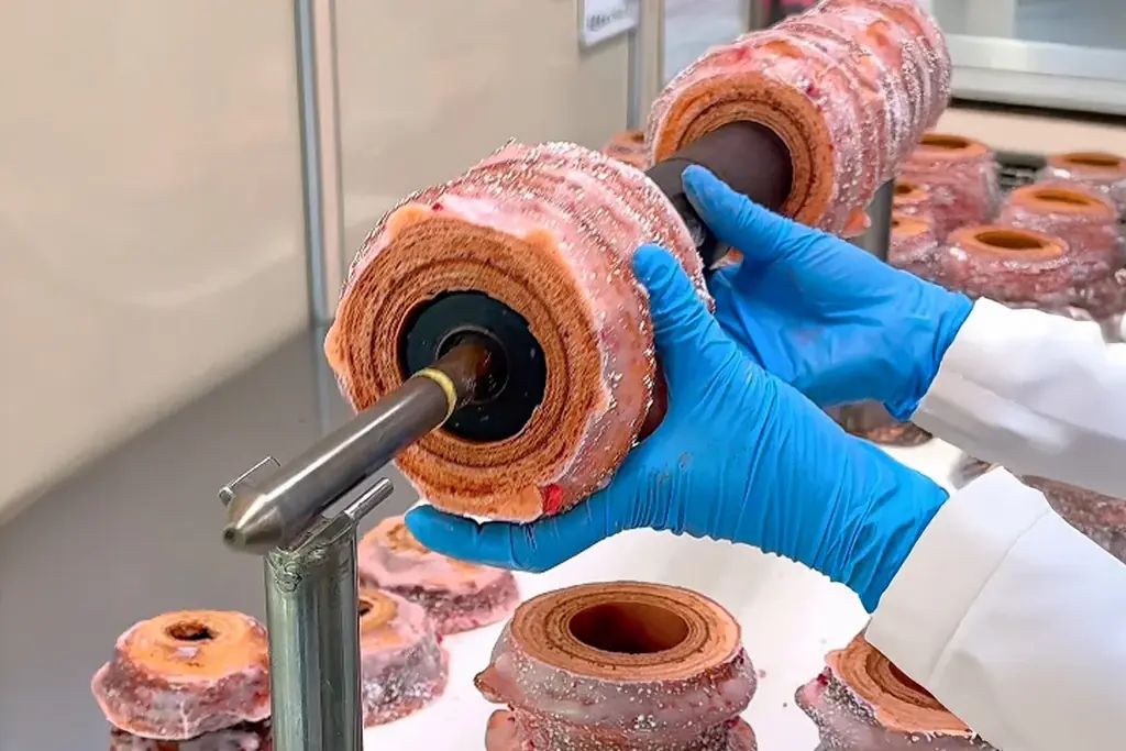 遠心力により生地が引き伸ばされるため、表面はしっかり焼き締まりサックリとした食感に、一方で内側は層が密に重なってしっとりともっちりした食感になります。工程の最後には成形コームで角度やタイミングを微調整し、山脈の峰のような独特の造形を整えます。