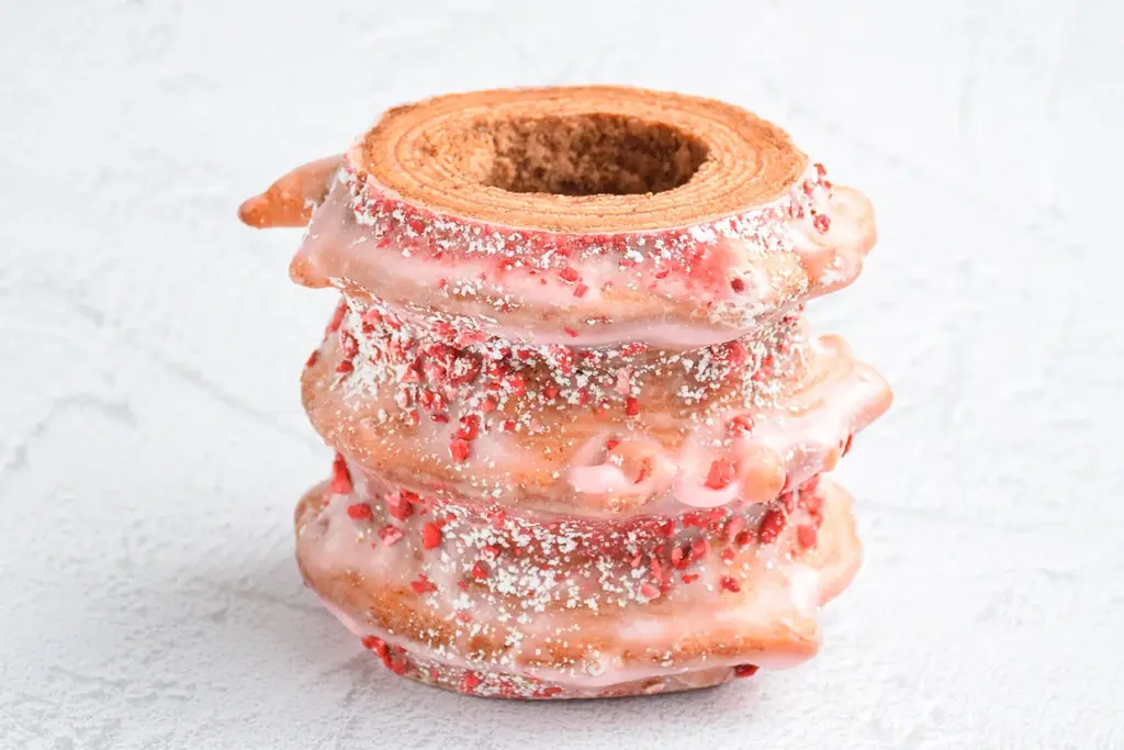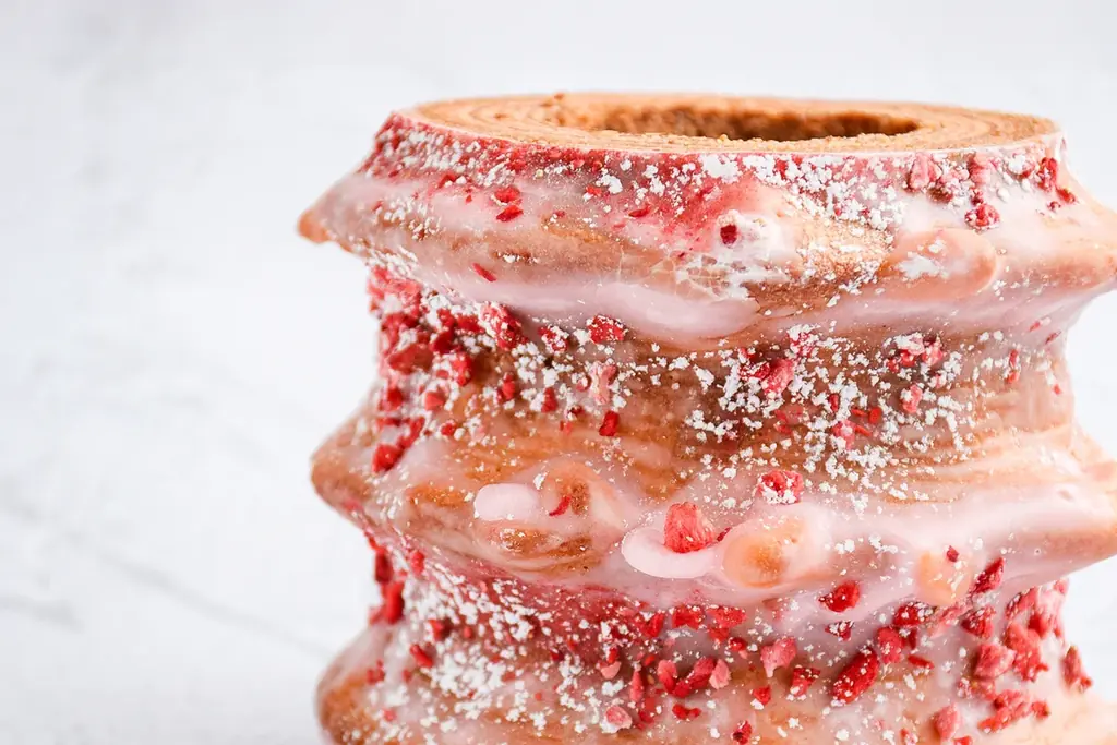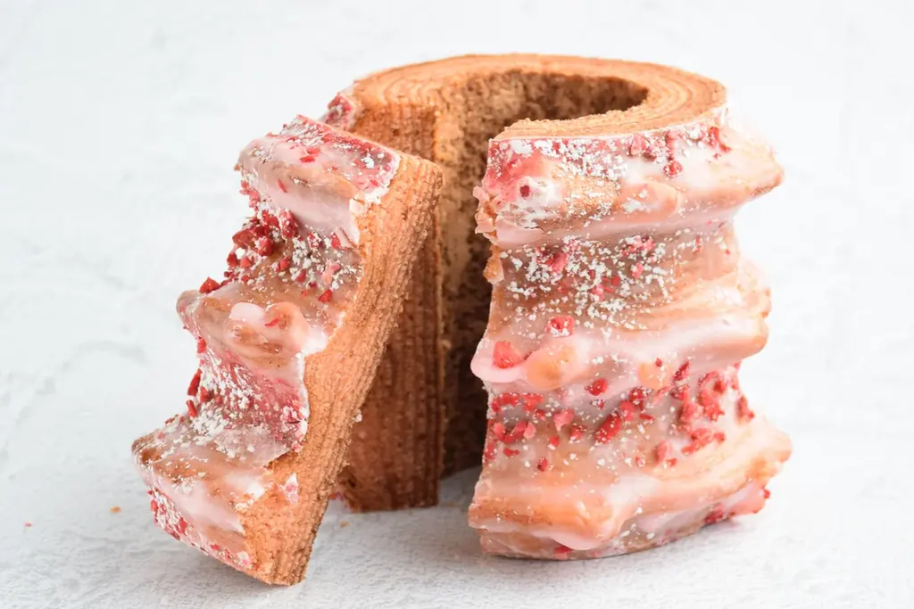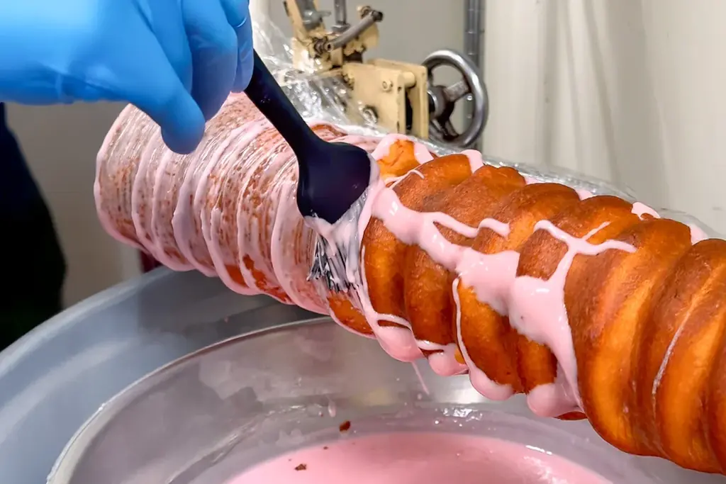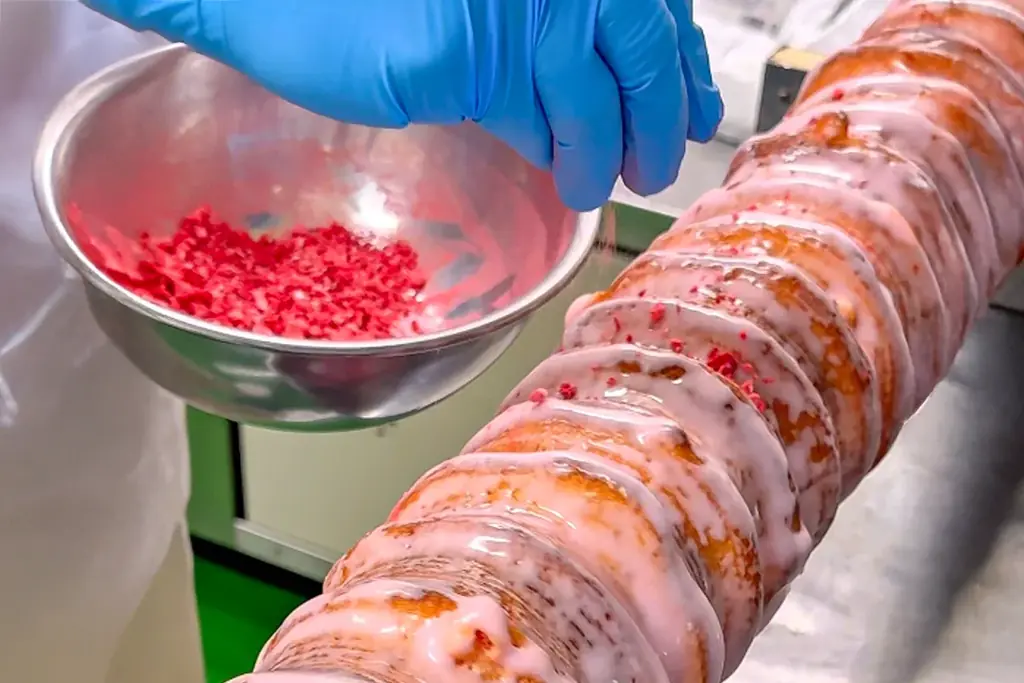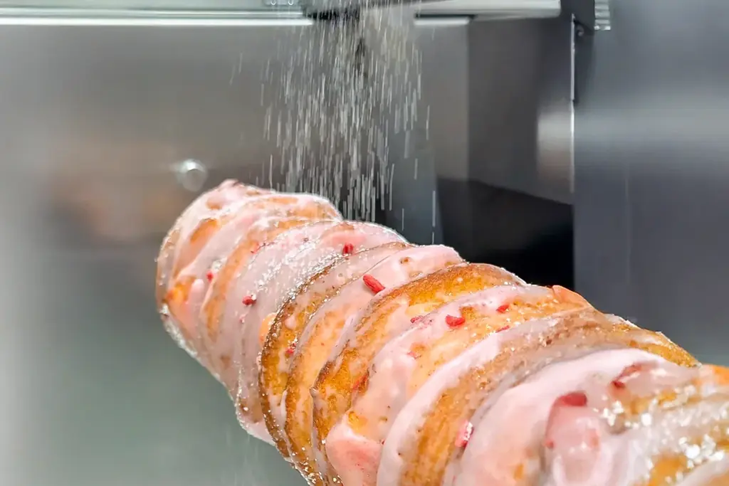 焼き上がったバウムに施すのは「ピンクのあまおうシュガーグラス」。表面を覆うコーティングに加えてフリーズドライ苺をまんべんなく配し、仕上げに粉糖をふんわりとかけることで、華やかな見た目に仕上げています。