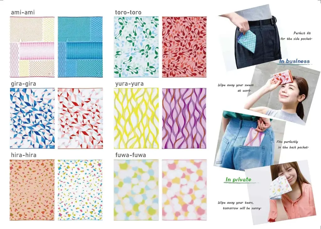 デザインはユニセックスな色柄を基調に、畳語(繰り返し言葉)をグラフィック化した視覚表現を採用しています。男女を問わず日常で使いやすい色味とパターンが揃っているため、さまざまなシーンに馴染みます。