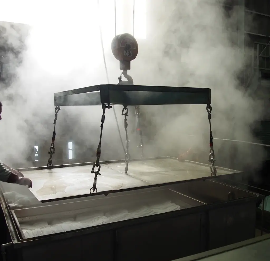 和晒は生地を釜でじっくり焚き上げ、乾燥させる手法です。同社では和晒釜で約4日間かけて水流と蒸気、薬剤を循環させてゆっくりと炊き上げる工程を行っています。このプロセスにより綿本来の風合いが引き出され、毛羽立ちによる高い吸水性と通気性が得られます。