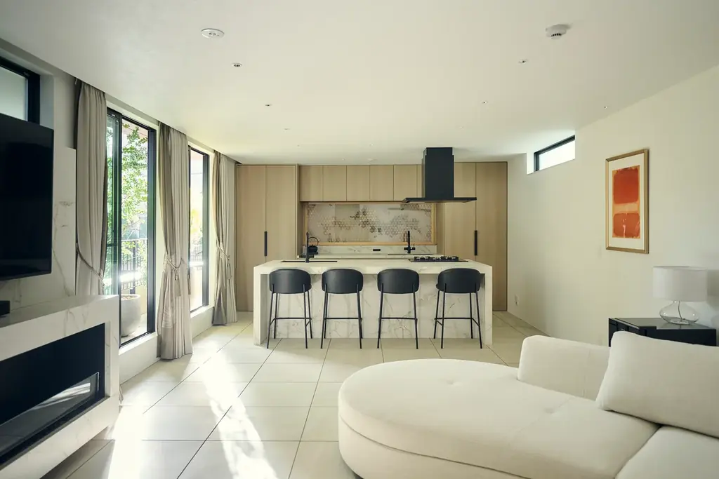 2階は「洞窟のリビング」を名付けられ、水蒸気暖炉の揺らぎや大型ソファ、白亜のアイランドキッチンなど、複数人の対話にもひとりの内省にも対応できる余白ある空間です。音と光のコントロールが重視され、滞在者が意識的に時間を使える設計になっています。