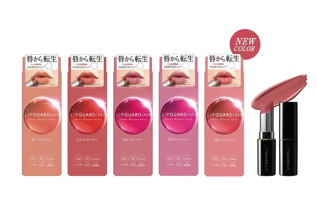 同ブランド「LIPGUARDIAN」シリーズの既存製品としては「リップガーディアン メロウラッピングルージュ」も好評発売中です。本製品は全4色に新色1色を加えた全5色で、各1,400円(税別、税込1,540円)という価格設定がされており、新色「06 ミューズムーン」は2026年2月26日先行発売、3月19日全国発売の予定です。