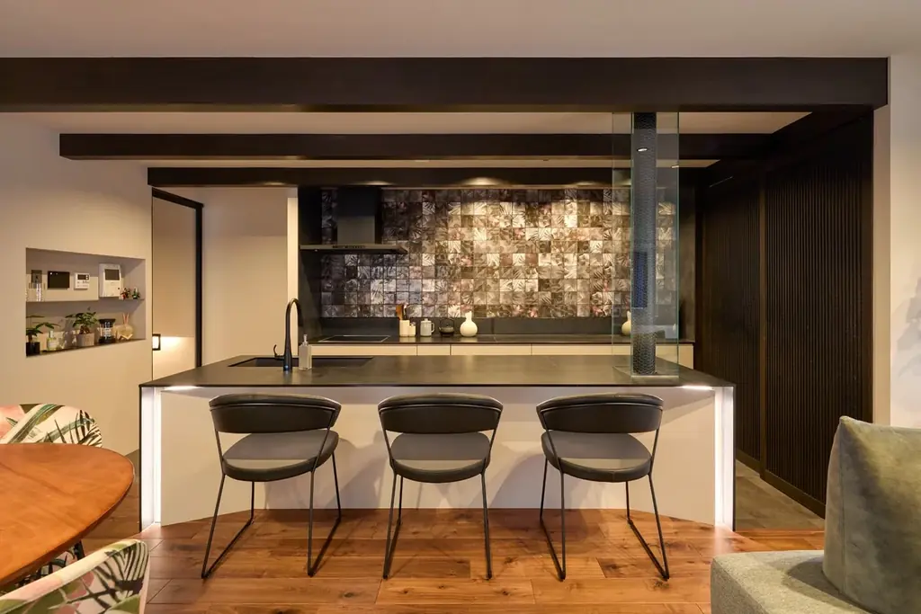 造作キッチンの採用により、単なる調理場を超えた空間の主役性が生まれ、ホテルライクな落ち着きと日常の利便性を両立しています。作業動線、収納計画、仕上げ材の選定が統合的に設計されているため、実際の使い勝手を確認することで導入後のイメージが明確になります。