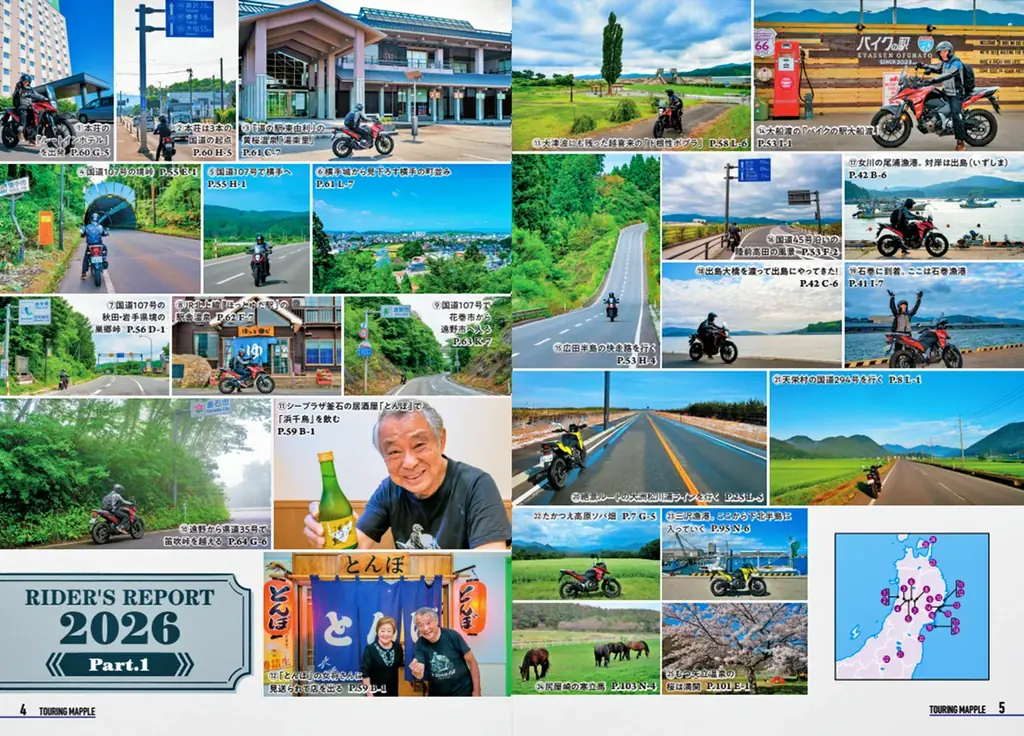 地図内容は取材担当ライダーによる実走取材、モニター情報、昭文社の地図データや取材網を活用して更新されています。道路や施設の開通・開業・閉鎖・移転といった経年情報に対応し、絶景や快走路、ワインディング、ダートといった道路コメントに加え、温泉、道の駅、グルメ、名水、歴史スポット、ダム、キャンプ場などのジャンル別コメントが追加または修正されています。