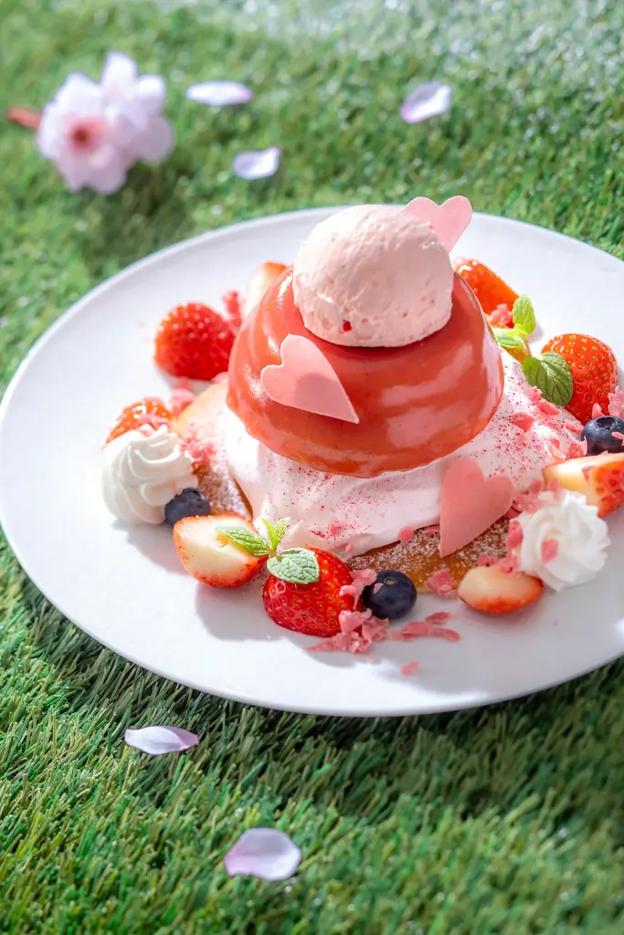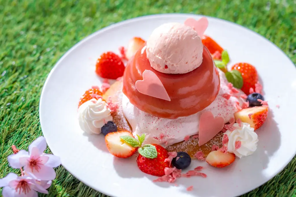 プレートはスフレパンケーキを中心に、たっぷりの苺ホイップと苺アイスミルクが添えられる構成です。桜の香りというフレーバー要素を取り入れ、季節感を表現しています。ドームを開くという演出は提供時の見た目にも配慮したもので、ソースがパンケーキに絡むことで味の変化を楽しめるようになっています。