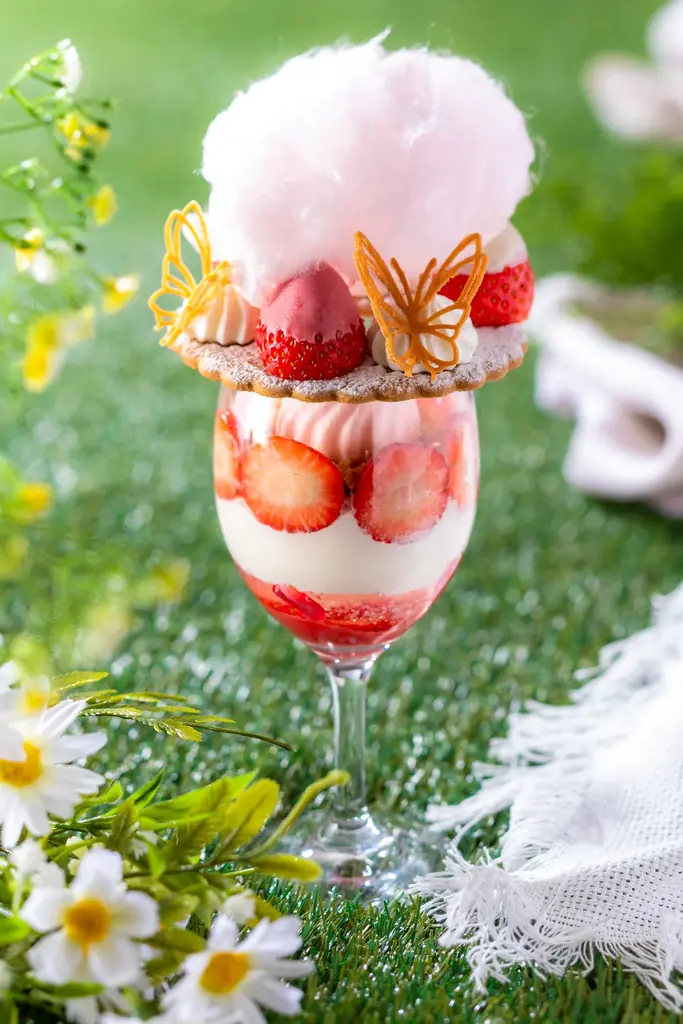 一品目の「いちごとフワフワわたがしパフェ」は、わたがしをトップにあしらい、蝶々のクッキーで春の情景を表現したグラスパフェです。プレスリリースの説明では、視覚的な華やかさとともに味の変化を楽しめる構成になっているとしています。