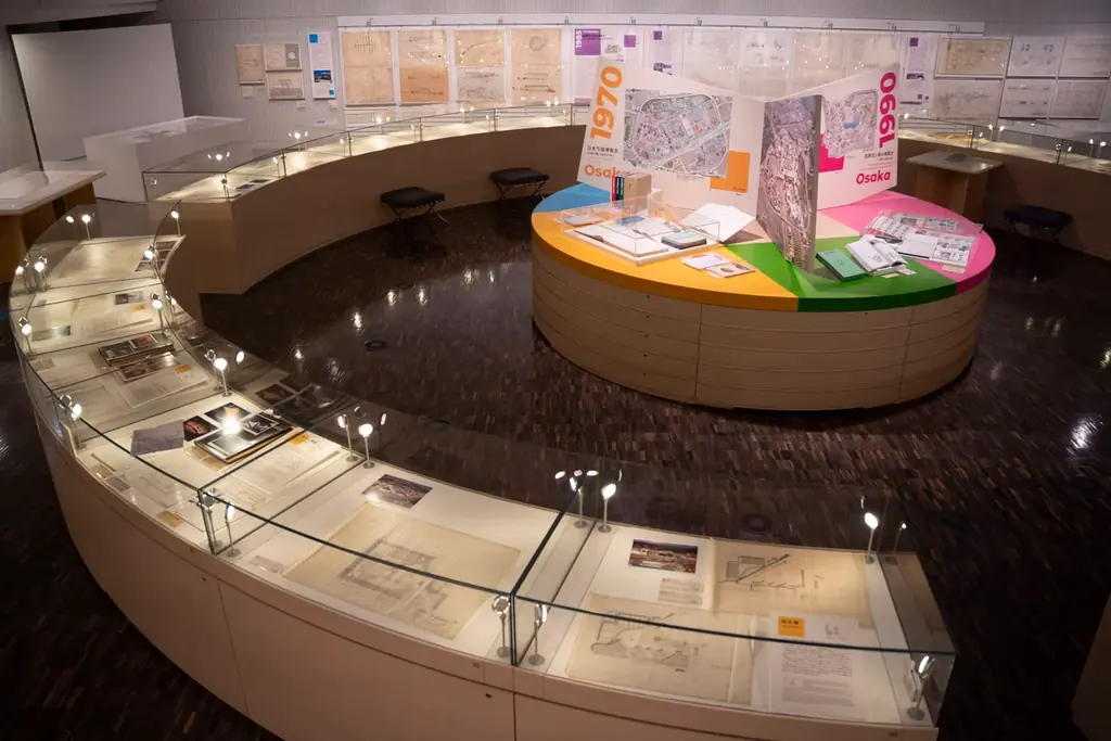 各万博については、会場配置や企画段階の図面、航空写真などを通じて、その時代が掲げた理念や空間構成の特徴を読み解ける構成としています。展示は、当館が所蔵する一次資料を基盤にしており、設計段階から運営までの変遷が視覚的に追えるよう配慮されています。