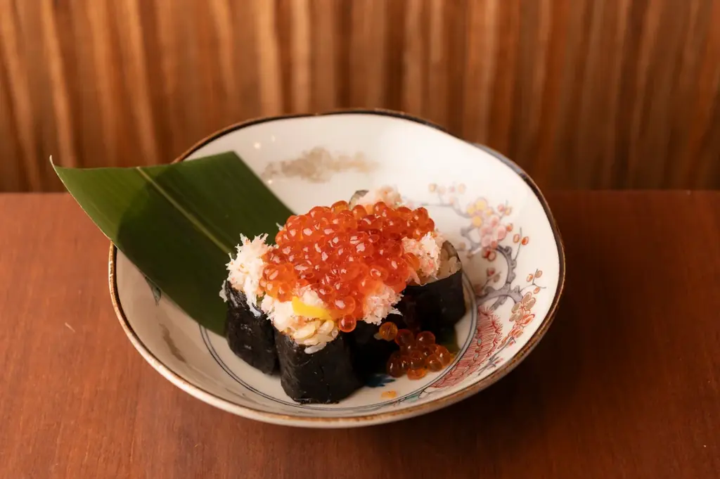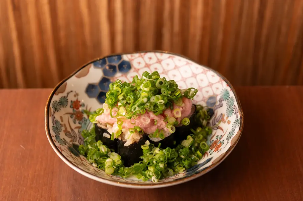 なみ小屋が掲げるもう一つの柱が、酒場仕様にアレンジした寿司「あて巻き」です。小ぶりな寿司に海鮮や薬味を合わせ、つまみながら飲むことを前提に設計されています。巻いて、つまんで、飲むという流れが浜焼きとの親和性を持ちます。