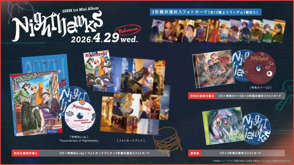 にじさんじ所属の男性ユニット3SKM(北見遊征、魁星、榊ネス)の1st Mini Album『Nighthawks』について、発売日や各形態の仕様、ジャケットビジュアル、封入特典などの公式情報を整理してお伝えします。発売日は2026年4月29日(水)です。