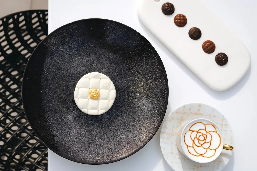ルーフトップでは、一つ星フレンチレストランベージュ アラン・デュカス 東京によるキルティングモチーフの白いムースケーキを中心としたティーセットを提供します。ケーキは視覚的なデザインだけでなく、味わいの構成にもこだわりがあり、バニラムースにキャラメルクリームやビスケット、フィヤンティーヌを組み合わせた層で構成されています。