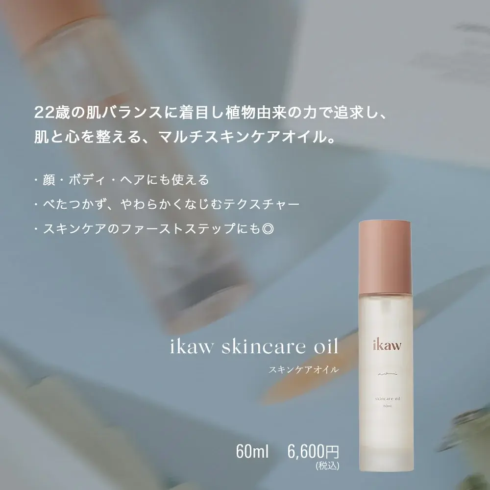 ikawの代表的アイテムであるスキンケアオイルは、60mlで単品価格が6,600円(税込)です。ブランド設立当初からのこだわりである「肌に心地よく寄り添うテクスチャー」を追求したプロダクトです。