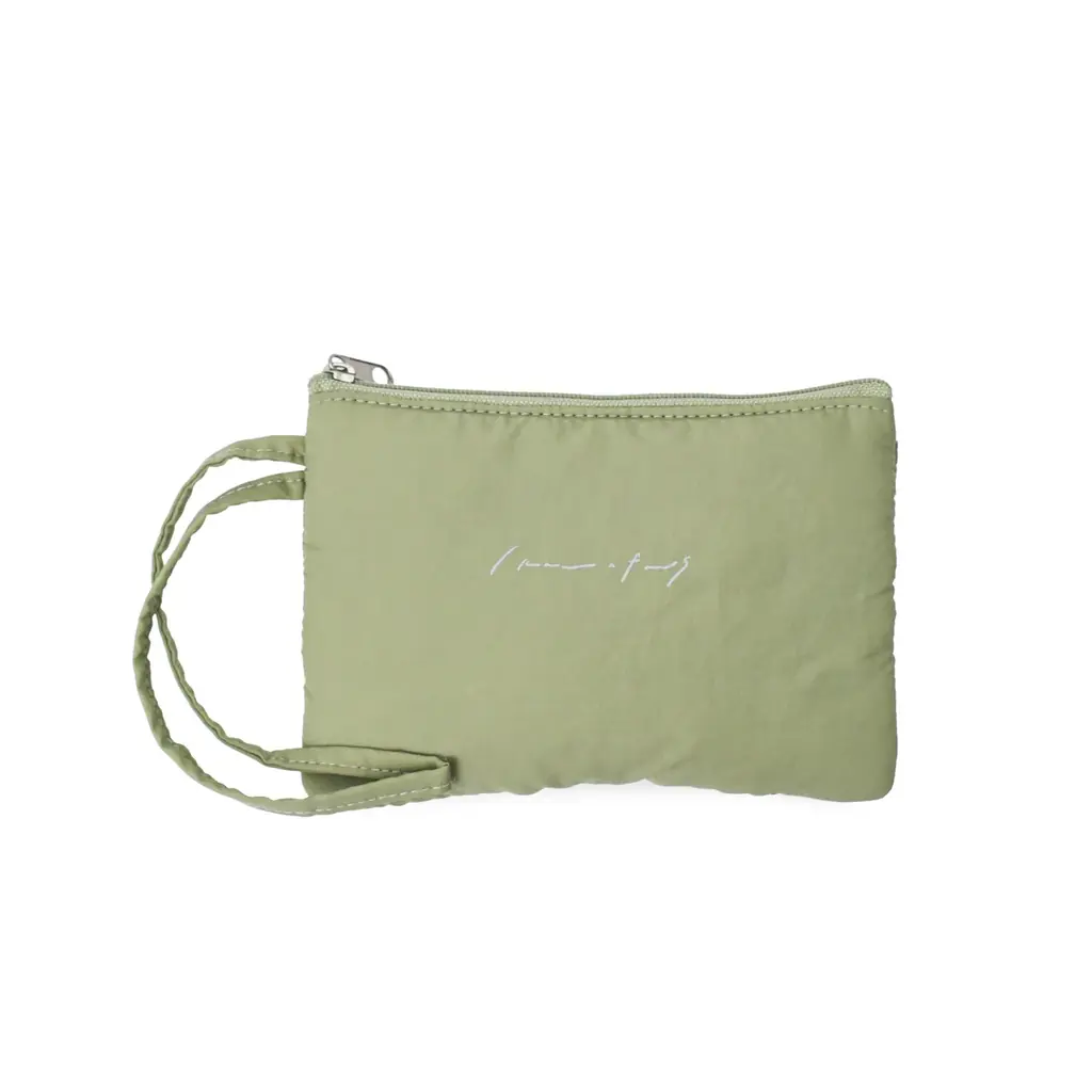 セットには日常使いを想定したオリジナルのナイロンポーチとヘアクリップも含まれます。ikawで人気のナイロンポーチは本コラボで復刻され、柔らかなセージトーンが特徴です。軽量な素材で小物の整理や旅行時の仕分けに適しています。