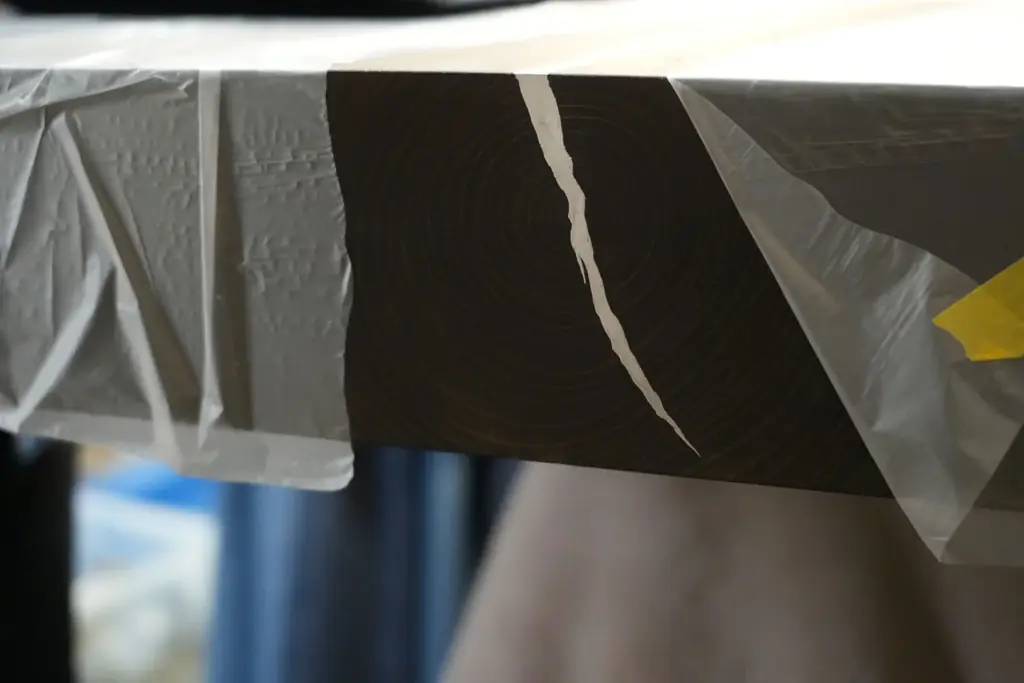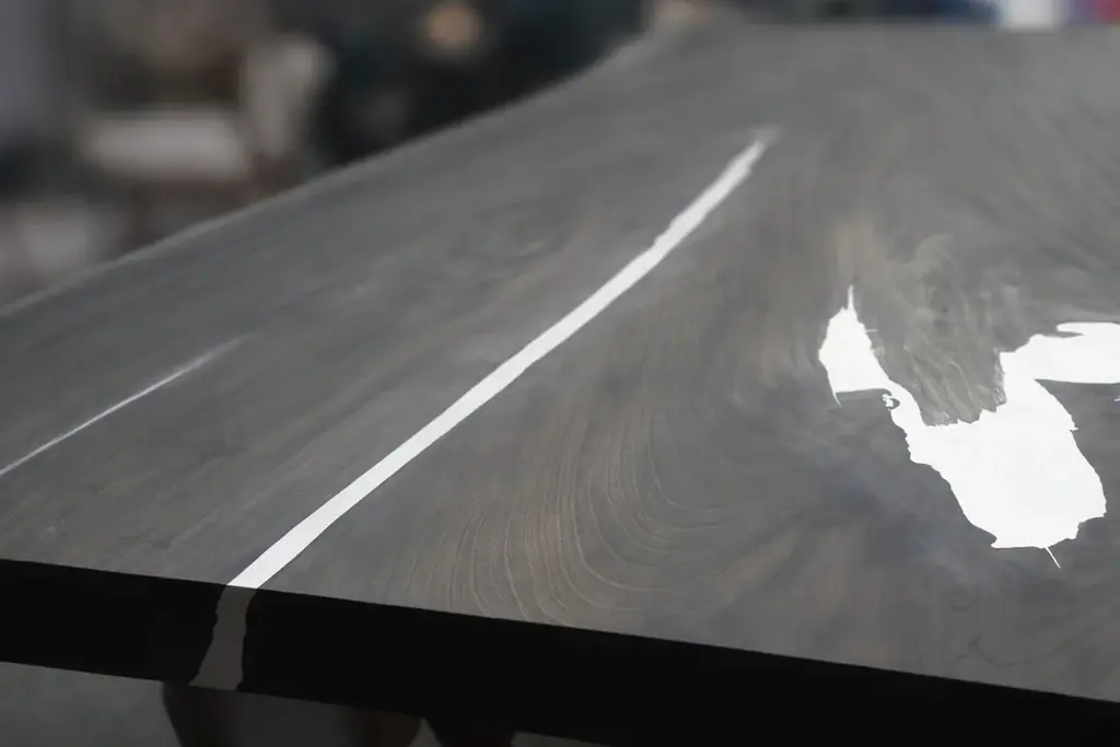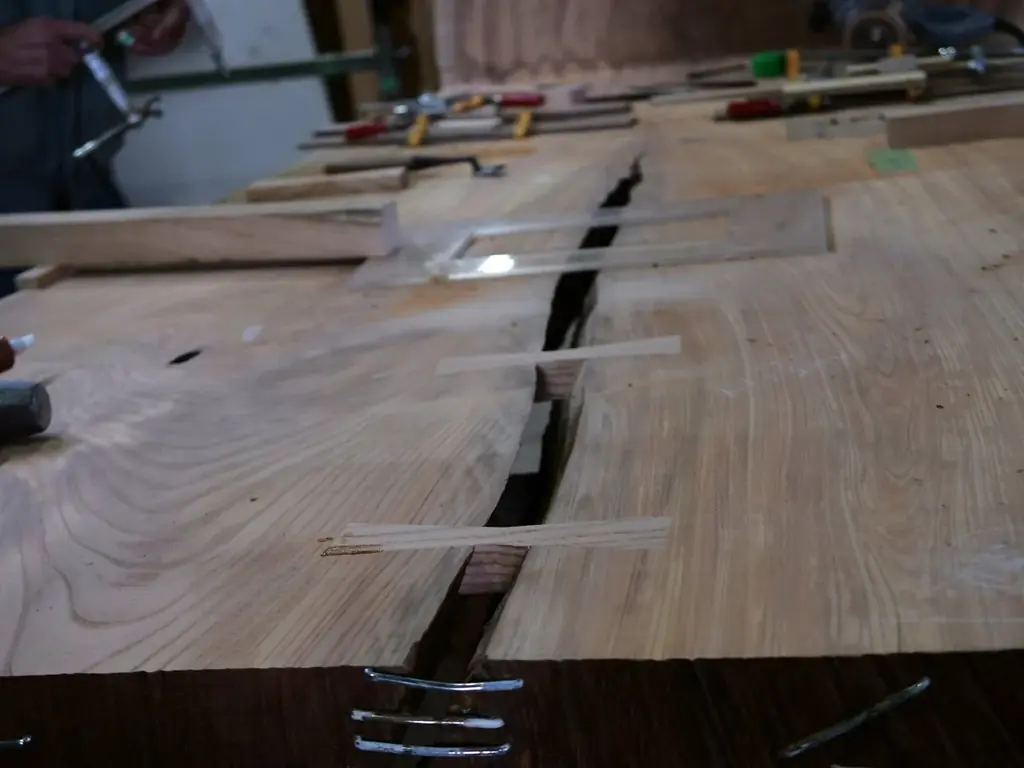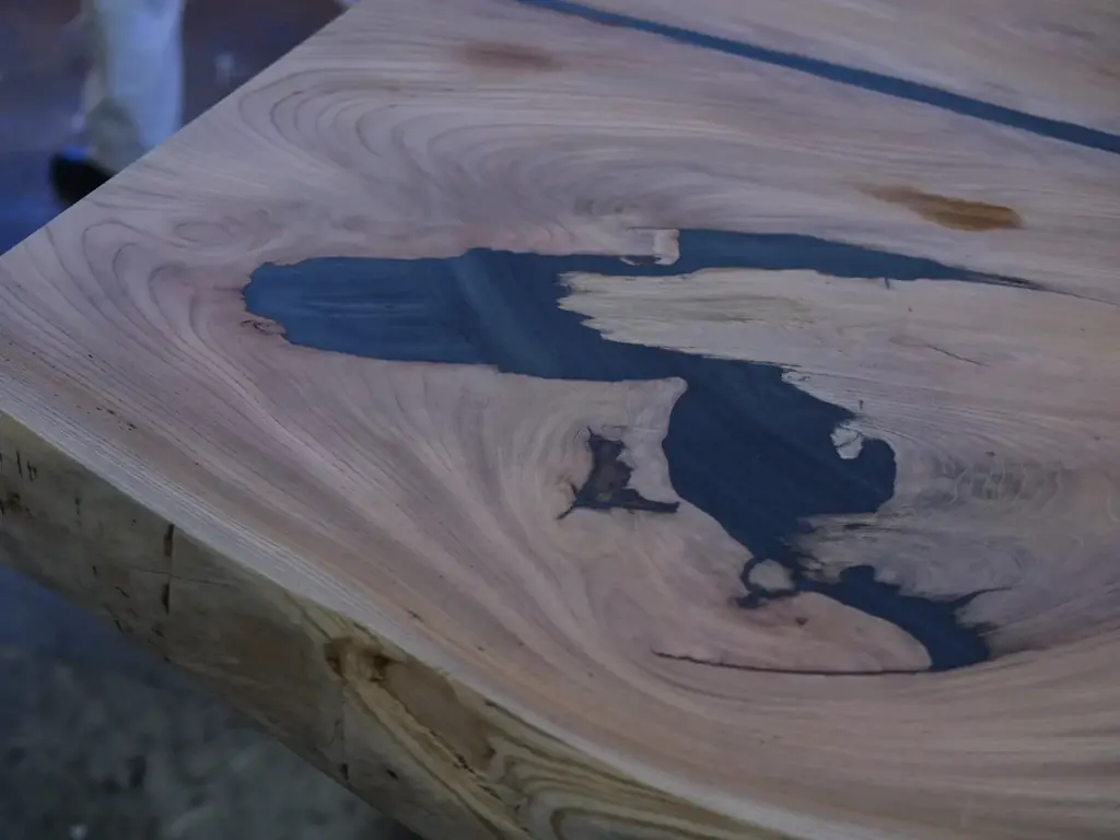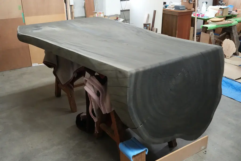 具体的には、鉄媒染仕上げによる落ち着いた天板の色調と、天板断面や大きな節に施した金継ぎ加工の銀が対比するような仕上げを採用している。割れが広がらないように裏側から「チギリ加工」を施し、木部の動きと漆の硬化性を両立させる工夫がなされている。