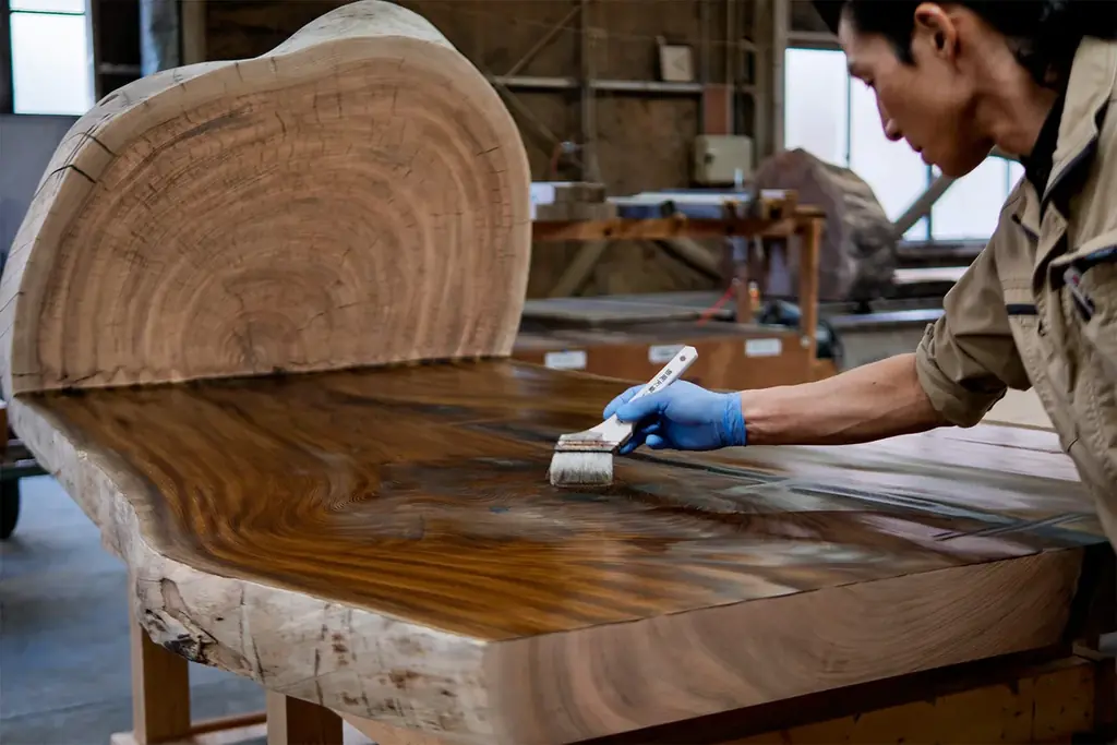 木材は多孔質であり、温度や湿度の変化で膨張・収縮を繰り返す“動く素材”であるのに対し、漆は硬化後に動かない性質を持つ。これまで木製家具に金継ぎを施すことは技術的ハードルが高いとされてきた。本作は岡崎製材の長年にわたる木材加工技術と、漆との親和性を考慮した素材選定・構造設計により、これらの課題に取り組んでいる。