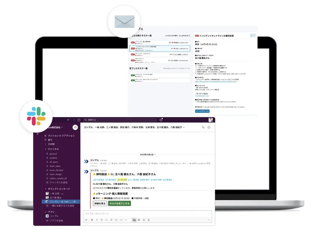 | 解消する課題 | eラーニング受講、評価目標提出、組織サーベイ、OSアップデート、2段階認証、表彰ノミネート等の未対応による生産性低下 |