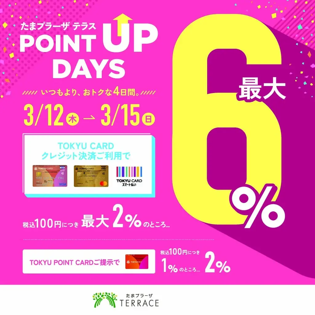 POINT UP DAYSは対象店舗でTOKYU CARDクレジット利用時のポイント加算率が期間中にアップする施策です。期間は3月12日(木)~15日(日)で、通常100円(税込)につき最大2%のところ、期間中は最大6%の加算が行われます。