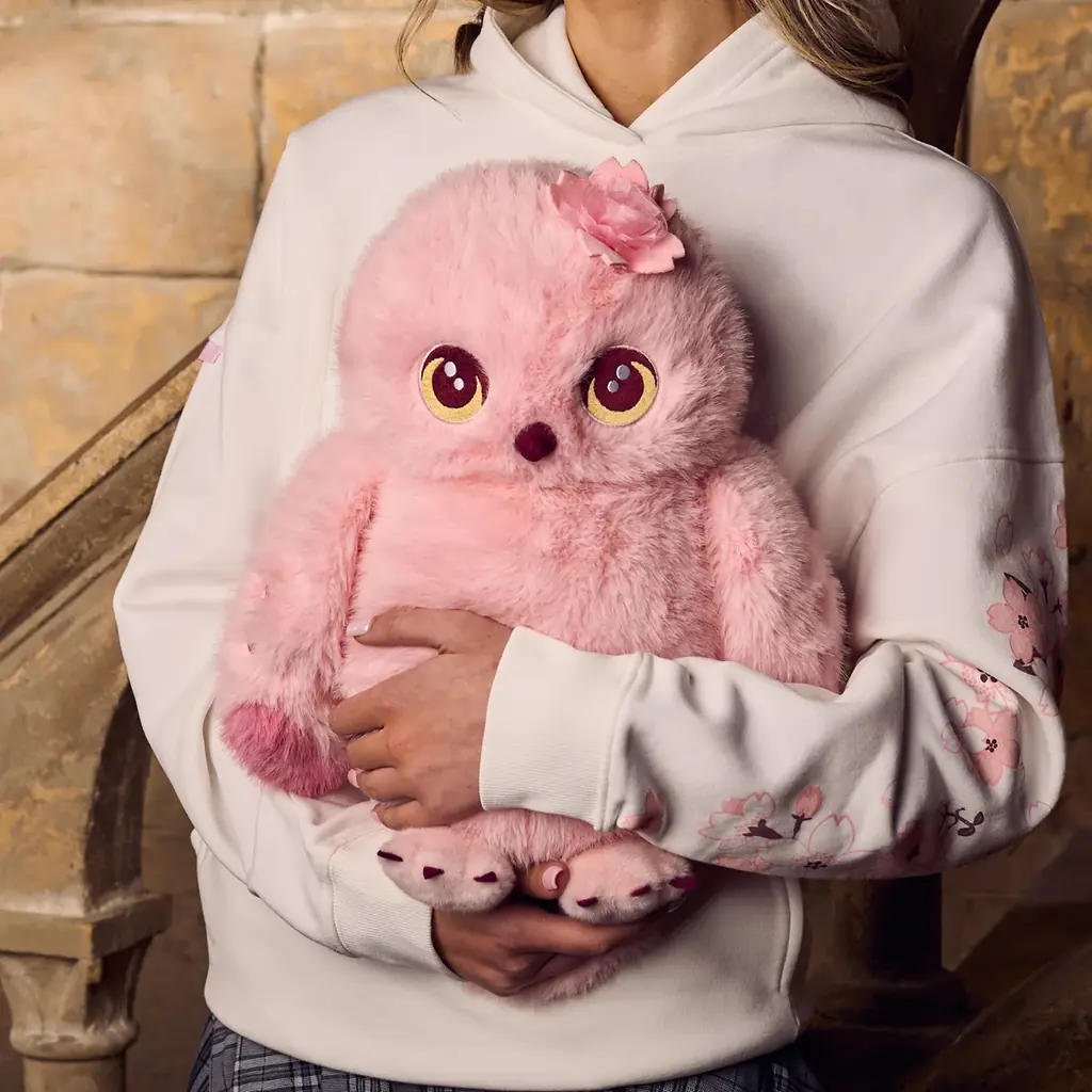 桜デザインをまとったフクロウのぬいぐるみ。やわらかなピンクのアクセントがあり、抱き心地の良いサイズ感を持つ。日本限定の特別アイテムで、ギフトやコレクション用途が想定されています。