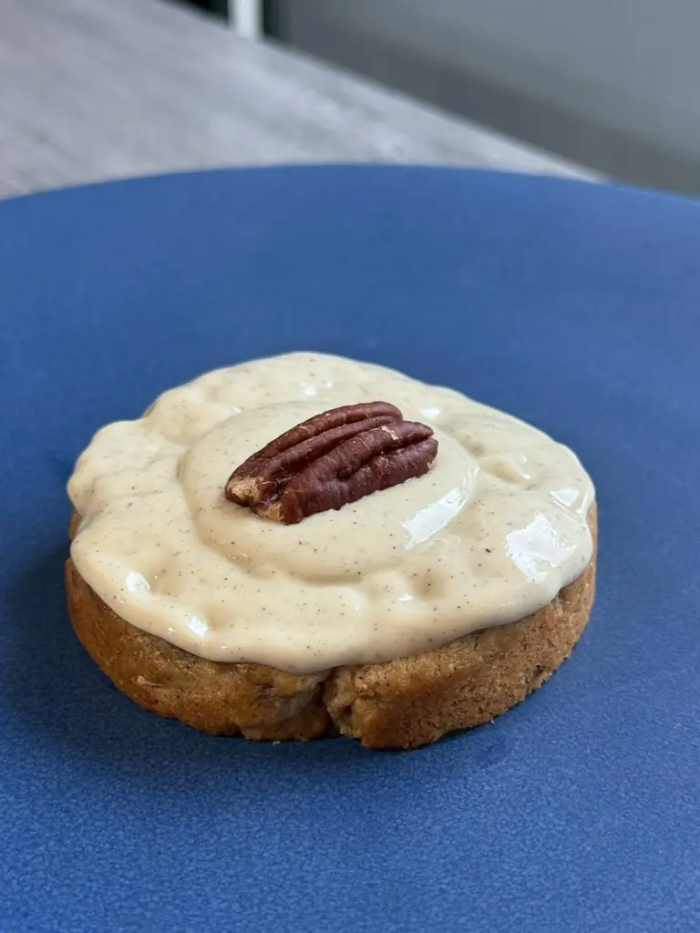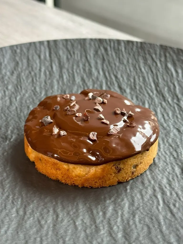 チョコとヘーゼルナッツを混ぜたソフトクッキーの生地に、濃厚な自家製塩キャラメルソースを合わせた一品です。塩味が加わることで甘さが引き締まり、全体のバランスが整います。