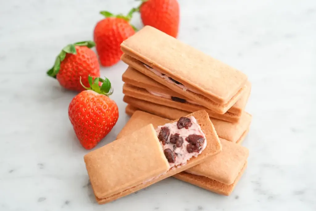 人気のサブレサンドに季節限定の苺が加わった商品です。サクサクと香ばしく焼き上げたサブレに、なめらかな苺クリームと甘酸っぱい苺の果肉を贅沢にサンドしています。