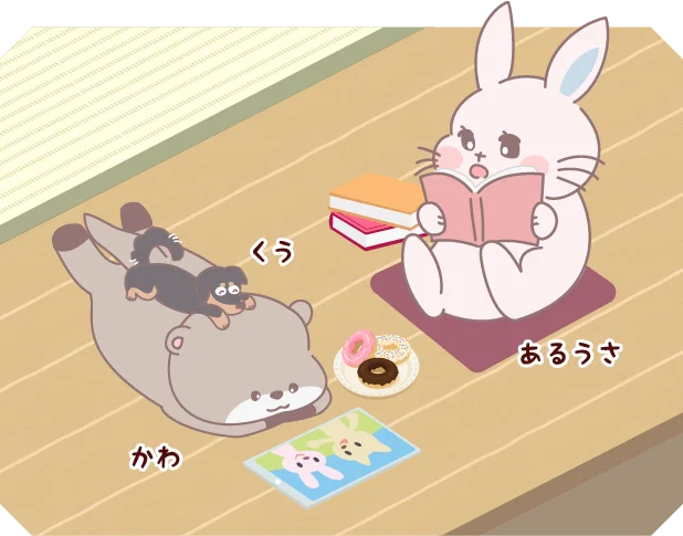 あるうさは創作品モール「あるる」のメインキャラクターで、ショップや作品との出会い、購入体験を象徴する存在です。あるうさの仲間には友だちのかわちゃんやペットのくうちゃんがおり、あるるモールの世界観の中で作品やお買い物を楽しむ描写が展開されています。