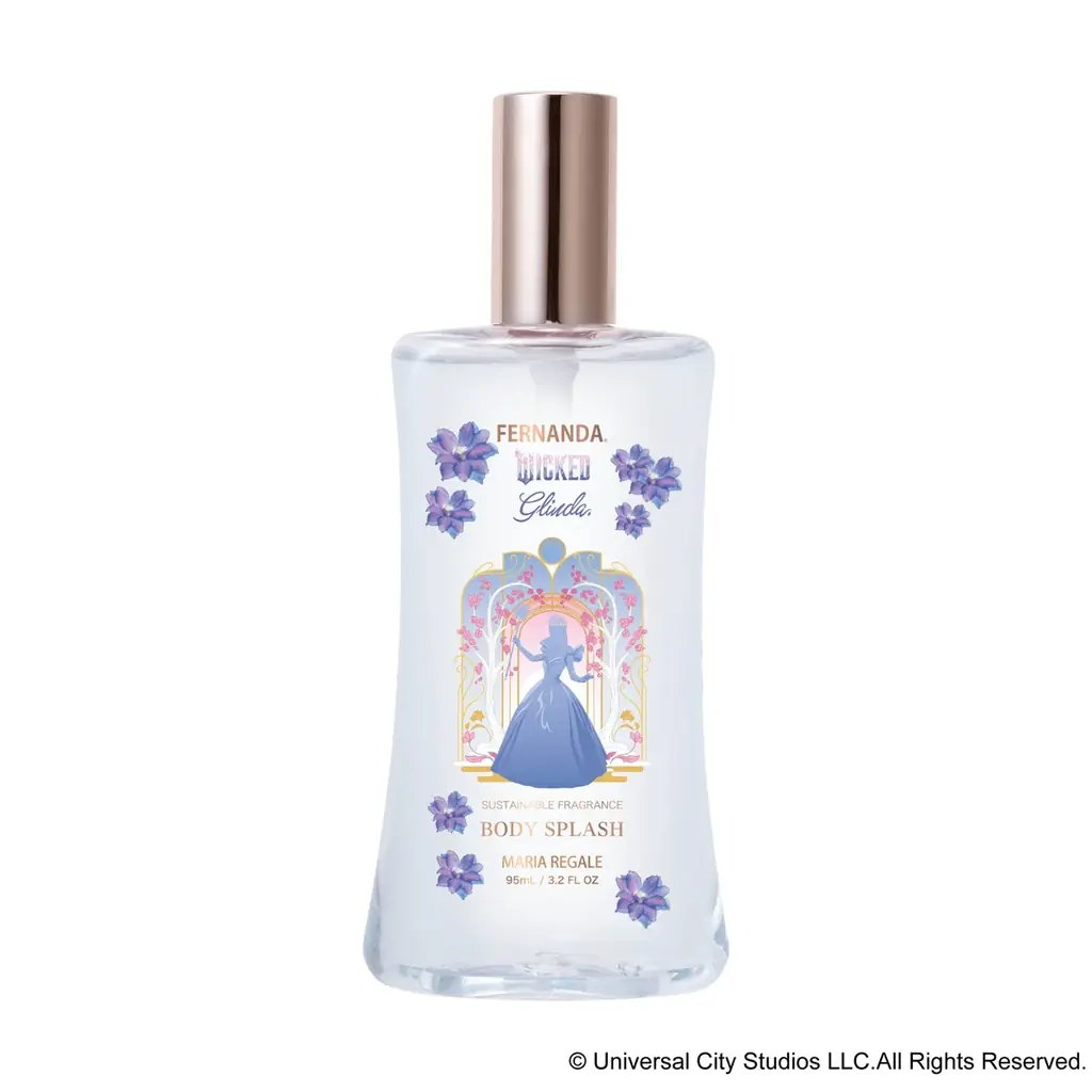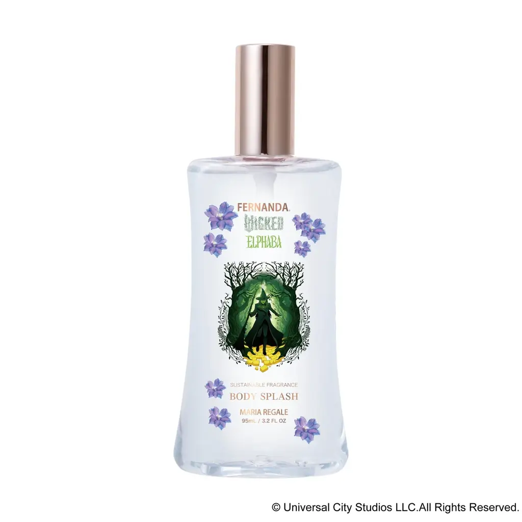 フレグランス ボディスプラッシュ マリアリゲルは、優雅で清潔感のある香りが楽しめるフレグランスボディミストとして紹介されています。限定パッケージはエルファバとグリンダのアートワークを用いたデザインです。