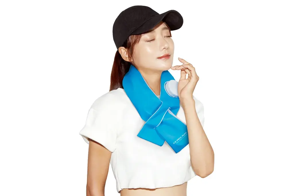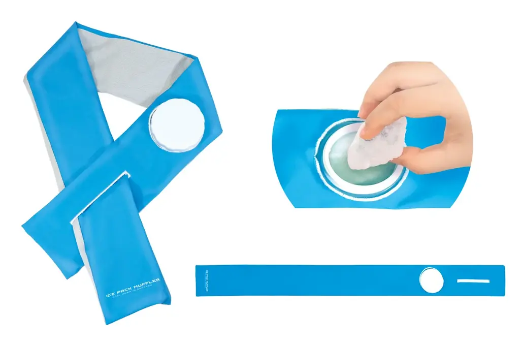 首元をやさしく冷やすマフラー形状のアイテムです。氷や冷水を入れるだけで使用でき、大型投入口を備えているためカチ割り氷(市販の割り氷)も入れやすくなっています。マフラー形状なので首に巻くだけでフィットし、両手が自由に使える点が利便性の高いポイントです。