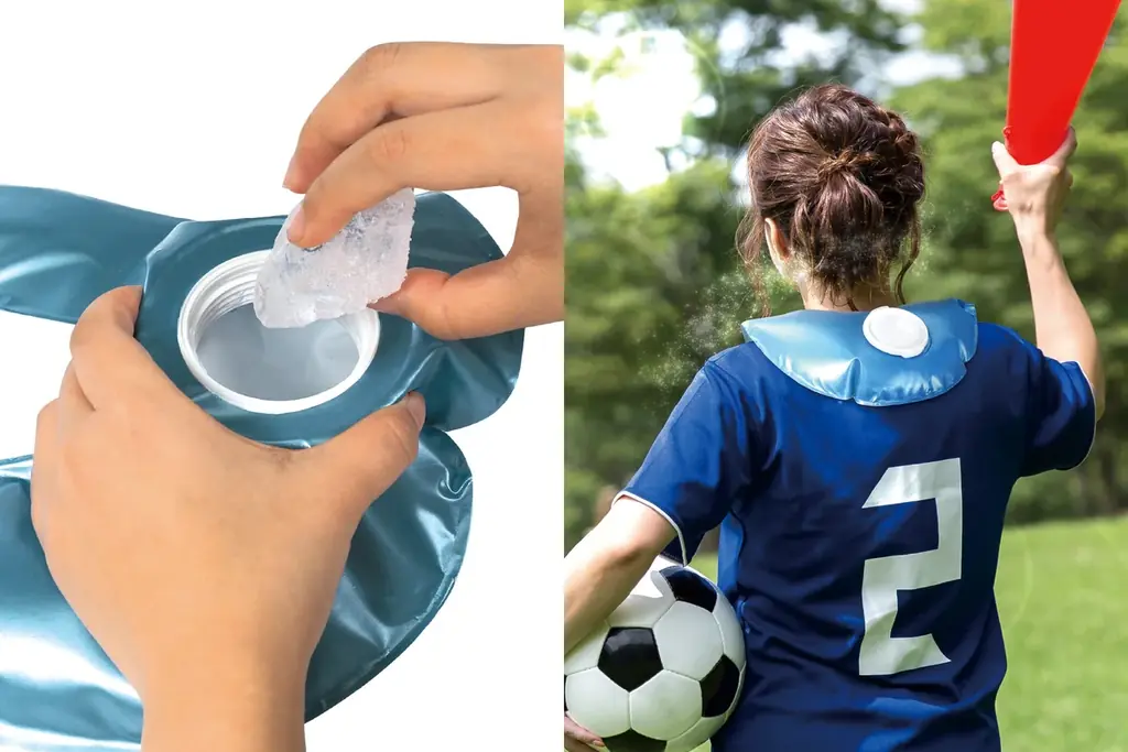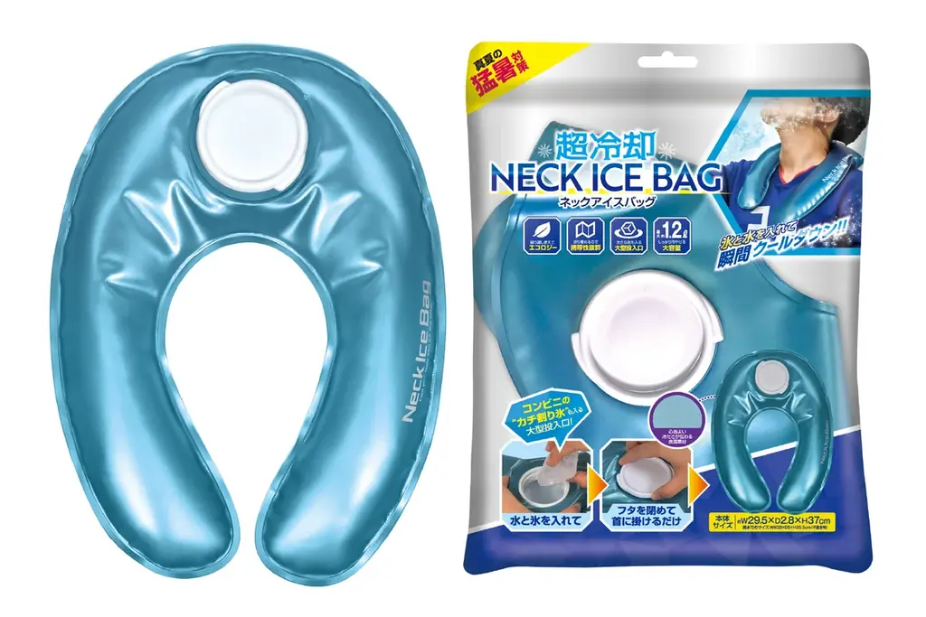 肩から背中にかけて一気に冷やせるワイド仕様が特徴のネックアイスバッグです。氷と水を入れて瞬間クールダウンが可能で、投入口は市販の割り氷も投入できる大きなサイズに設計されています。携帯性の高い折り畳み収納が可能で、持ち運びしやすい点が特徴です。