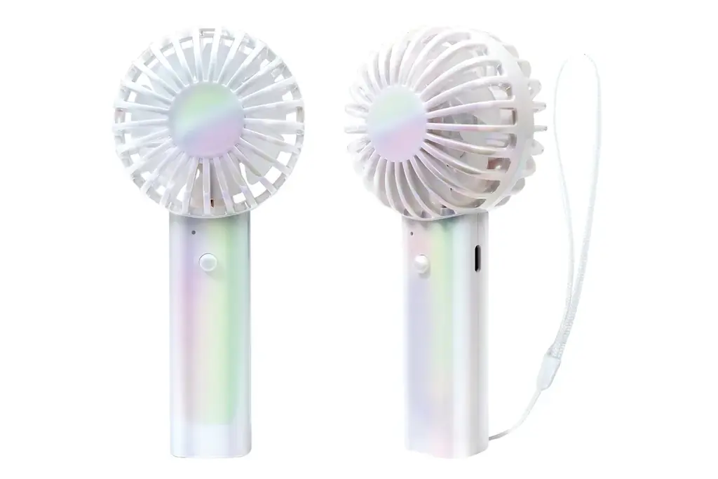 トレンド感のあるオーロラカラーを採用した充電式のハンディファンです。持ち運びできるサイズで通勤・通学、オフィスや屋内での使用に適しています。デザイン面での訴求を意識した商品で、携帯性と見た目の両立が図られています。
