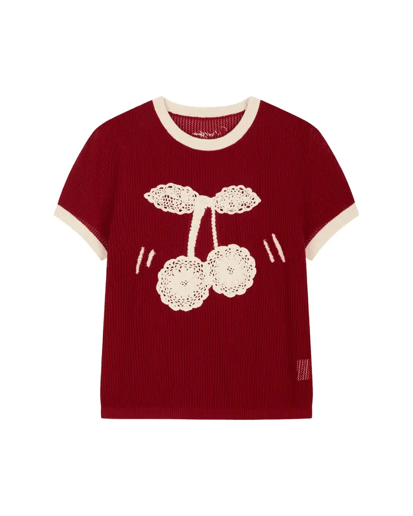 • ニットTシャツ:36,000円 — レース調の手編みでクラシックかつダイナミックなチェリーモチーフを表現。透かし編みと組み合わせ、ヴィンテージムードを漂わせる仕上がり。