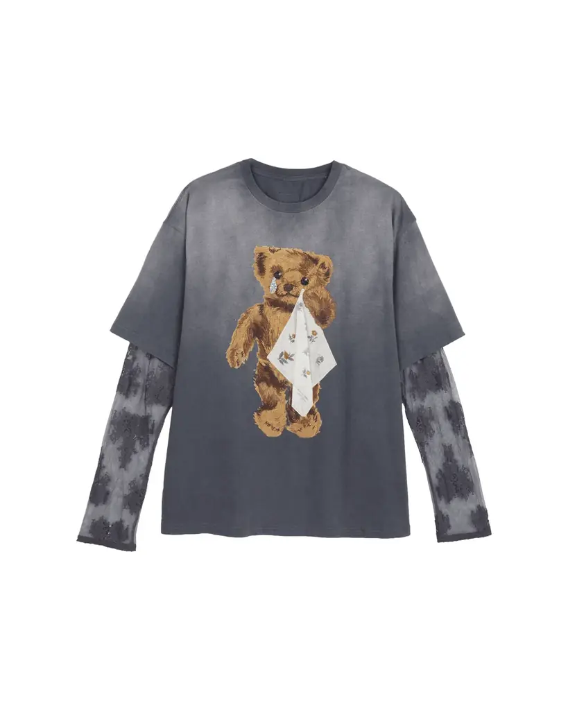 • レイヤードトップス:40,000円 — ハンカチで涙を拭うテディベアをモチーフに、植毛加工やビーズ刺繍を重ねた一着。立体感ある細工が豊かな物語性を表現し、袖のレースがレイヤード風のアクセントとなっている。