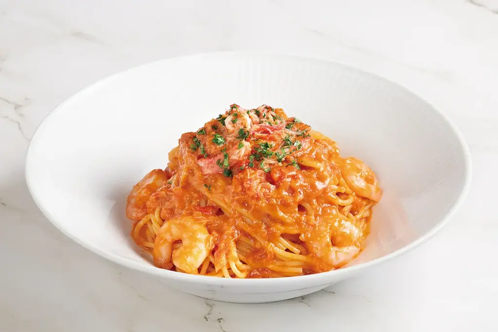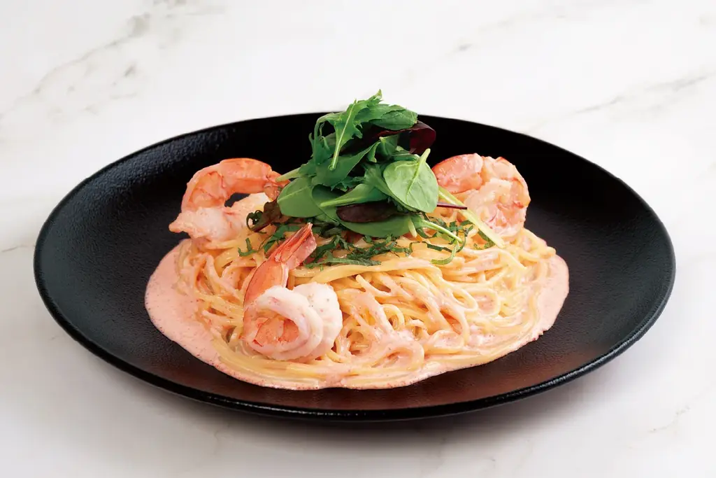 博多明太子がクリームソースと調和し、海老の弾ける食感と豊かな風味が楽しめる一皿です。プレスリリースでは、口どけとコクのバランスにこだわったソースと表現されています。