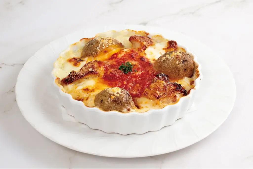 皮ごと味わえる新じゃがいもを香ばしくローストし、柔らかいローストチキンと組み合わせたマカロニグラタンです。春ならではのみずみずしさとホクホク感を活かしています。